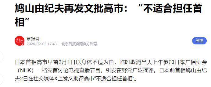 清算,开始了! 高市早苗万万没想到,让她下台的致命一击,不是来自外部,而是来自日本自民党的老前辈。鸠山由纪夫已经不再留任何情面,直接向高市发出了最后的“政治通牒”:涉台错误言论破坏日中关系,不能继续担任首相! 其实高市落到今天这步,半点都不冤,全是她自己作出来的。 去年11月在国会答问时乱说话,声称要是中国大陆对台湾出动军舰、使用武力,就可能构成日本的“存亡危机事态”,还说日本自卫队可以行使集体自卫权。 中国这边从来都不惯着这种挑衅行为,直接出手反制了。 先是发布赴日旅游安全提醒,紧接着停了日本水产品进口,最后还出了个狠招——实施两用物项出口管制,上千种材料、设备和技术都不让出口到日本。 这反制的效果,用立竿见影来形容都不为过,日本各行各业很快就尝到了苦果。 也正是因为这实打实的损失,连自民党的老前辈鸠山由纪夫都坐不住了,直接不顾同党情面,站出来坚决反对高市早苗。 鸠山从始至终都是中日友好的坚定支持者,和高市那套挑衅的路子完全不是一路人。 他当年当首相的时候,就奉行“友爱外交”,提议构建东亚共同体,还特意去侵华日军南京大屠杀遇难同胞纪念馆道歉。 这些年他不光当中国多所大学的荣誉教授,推动中日民间交流,还呼吁日本加入亚投行、参与“一带一路”,今年更是提议中日在电动车、半导体领域加强合作,应对老龄化问题。 高市自己也慌了神,为了巩固执政地位,她干脆提前解散了运作才一年多的众议院,宣布2月8日重新选举,想搞一场“政治豪赌”,可没想到这步棋走得更臭。 更麻烦的是,众议院解散后,国会陷入事实停摆,2026年度的预算案审议被延后,老百姓担心物价上涨、养老金没保障,对她的不满越来越深。 而鸠山在日本政界和民间都有不小的影响力,他这一站出来反对,肯定会让不少原本支持高市的选民改变想法,这对她来说,无疑是雪上加霜的致命一击。 现在说白了,针对高市早苗的清算已经全面开始,她能不能保住首相位置,谁也说不准。 但有一点是肯定的,她落到今天这步,全是自己的政治野心害的,眼里只有权力,不管中日友好的大局,不顾日本民众的死活,一门心思搞挑衅、搞扩张。 就算没有鸠山站出来,迟早也会被民众抛弃。 不管最后高市的结局如何,有一个道理是绕不开的:不管将来谁来当日本首相,只有坚持中日友好,把民生放在心上,才能坐稳首相位置。 要是还像高市早苗这样,一味跟着美国跑,一味挑衅中国,不顾大局、不顾民生,只会把日本带向更危险的境地,到最后,肯定会被所有人抛弃。