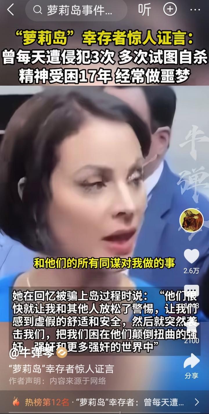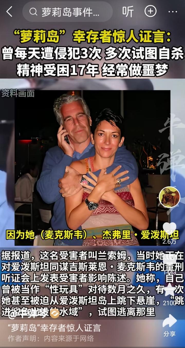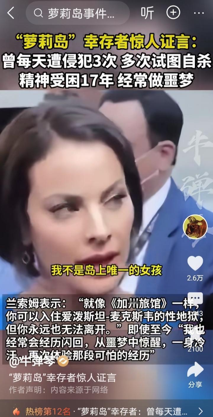 萝莉岛幸存者证言让人窒息! “你可以入住,但你永远无法离开。”——“萝莉岛”幸存者兰瑟姆引用《加州旅馆》的歌词,控诉爱泼斯坦一手打造的权力与罪恶共生的人间地狱毁了她的一生!她被圈禁在岛上有时一天被侵犯数次,即便现在肉身已经逃离那里,但是17年来精神牢笼依旧未破,她坦言即使至今"我也经常会经历闪回,从噩梦中惊醒,一身冷汗!” 要知道,最令人不寒而栗的不是爱泼斯坦的暴行,而是那张至今仍若隐若现的“客户名单”。爱泼斯坦嘎了,但是当年出入岛上的那些位高权重的“客户”至今仍然逍遥法外。有分析认为,更多受害者慑于他们的权势至今不敢站出来作证。 当法律在金钱面前低头,当正义被权势扭曲,那些未成年女孩的血泪却成了权贵们心照不宣的“入场券”,曾经的“文明灯塔”国度显得如此荒唐可笑。 兰瑟姆的证言是控诉,更是警钟。如果司法不能彻底揭开遮羞布,不能还受害者一个公道,那么所谓的文明社会,也不过是披着法治外衣的“丛林”罢了。在这片丛林里权力与罪恶共生,无辜的受害者人生被掳掠。正义不应迟到,更不该缺席! 幸存者的泣血控诉,美国司法部公布的300万份文件,是否能唤醒那些长期替大洋彼岸站台的人呢?