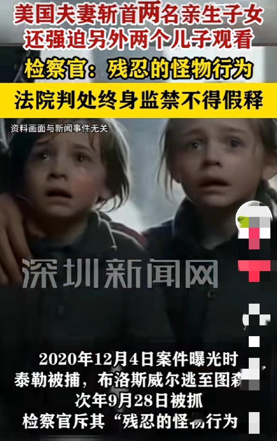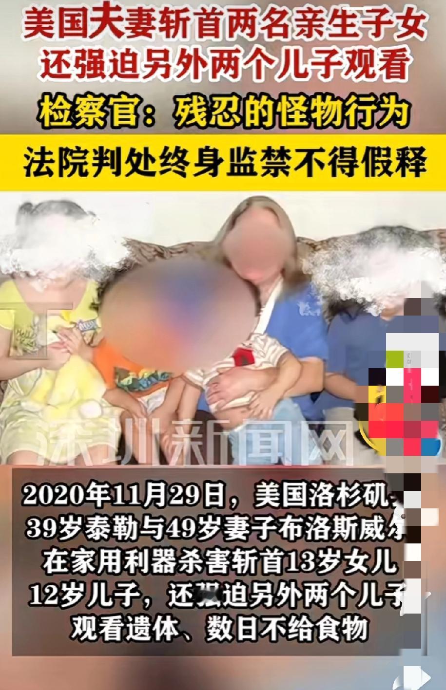 这就是恶魔,毫无人性!美国夫妻斩首2名亲生子女,强迫8岁9岁儿子观尸,终身监禁难抵罪恶滔天 2026年2月2日,美国洛杉矶县地方法院的一纸判决,为一桩尘封5年的灭亲惨案画上句点,也让全网为之震怒。被告人泰勒与妻子布洛斯威尔,因残忍斩首两名亲生子女、虐待幸存幼子,被判处两个连续终身监禁,不得假释,另加6年监禁,法律终为无辜孩童讨回公道。 案件始于2020年11月29日,彼时39岁的泰勒与49岁的布洛斯威尔,在加州兰卡斯特市的家中,向亲生骨肉举起屠刀。他们用利器残忍刺杀13岁的女儿马丽亚卡、12岁的儿子小毛里斯,更令人发指的是,行凶后竟将两名孩子残忍斩首。 杀人恶行并未终止,这对泯灭人性的父母,随即强迫家中年仅8岁、9岁的两个幼子,直面兄姐惨遭斩首的遗体,以此施加极端精神折磨。随后二人将两名幼子关入房间,连着数日不提供充足食物,任由孩子在恐惧、饥饿与绝望中挣扎。这哪是父母,这是比魔鬼都可怕的怪物! 惨案发生后,由于当时正值疫情隔离期,所以迟迟没有被发现,后来泰勒无故旷工又失联多日,其老客户忧心不已,于2020年12月4日以燃气泄漏为由报警。消防员与警方入户核查时,当场发现两名孩子的遗体,现场惨状让办案人员震惊,官方直言此案手段极端残忍,令人发指。 泰勒当日被捕归案,布洛斯威尔却仓皇逃窜至亚利桑那州图森市,隐匿近1年后,于2021年9月28日被警方抓获。案件历经数年审理,2025年11月,陪审团经缜密核查,裁定二人两项一级谋杀罪、两项儿童虐待罪全部成立,确认刀具刺杀、斩首的犯罪事实。 太残忍了!对亲生子女痛下杀手,不仅剥夺两条鲜活生命,更逼幼童见证血腥惨案,将骨肉亲情弃如敝履,彻底突破了人性与伦理的最低底线。他们的行为简直是泯灭良知。他们不配为人父母,更不配生而为人,他们就应该被世人唾弃。 既然不爱为什么要生养?既然给了孩子生命,就应该细心呵护,守护孩子们健康成长,不管是出于什么原因,对自己孩子下此毒手都不可饶恕。我认为,对于这种恶魔终身监禁都便宜他们了…