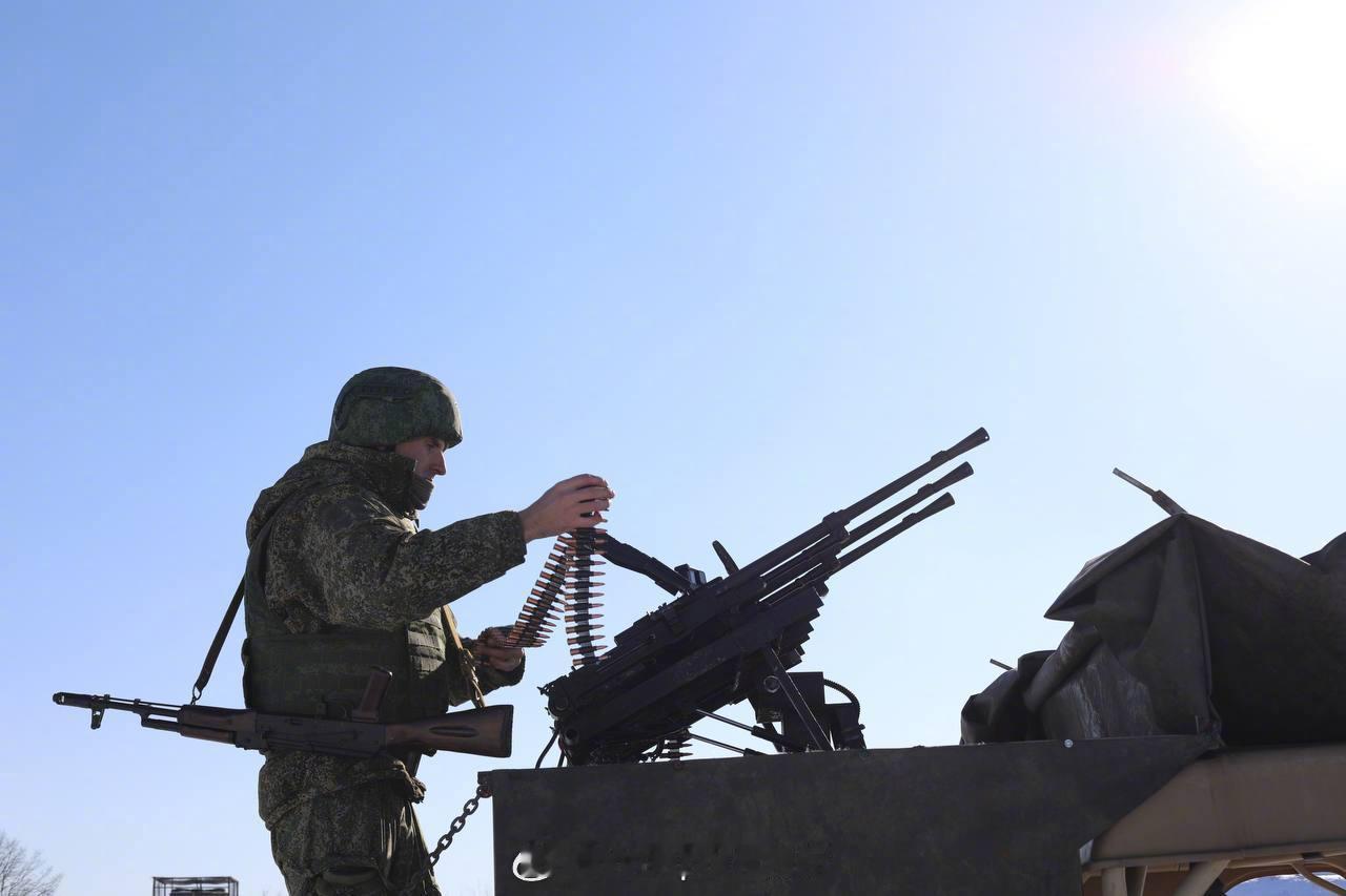 烽火问鼎计划每天认识一件兵器 俄罗斯南部军区的志愿反无人机部队的预备役人员正在接受反无人机训练。中国造的沙漠越野全地形车上,安装了3挺并联的坦克机枪,用于对空射击。