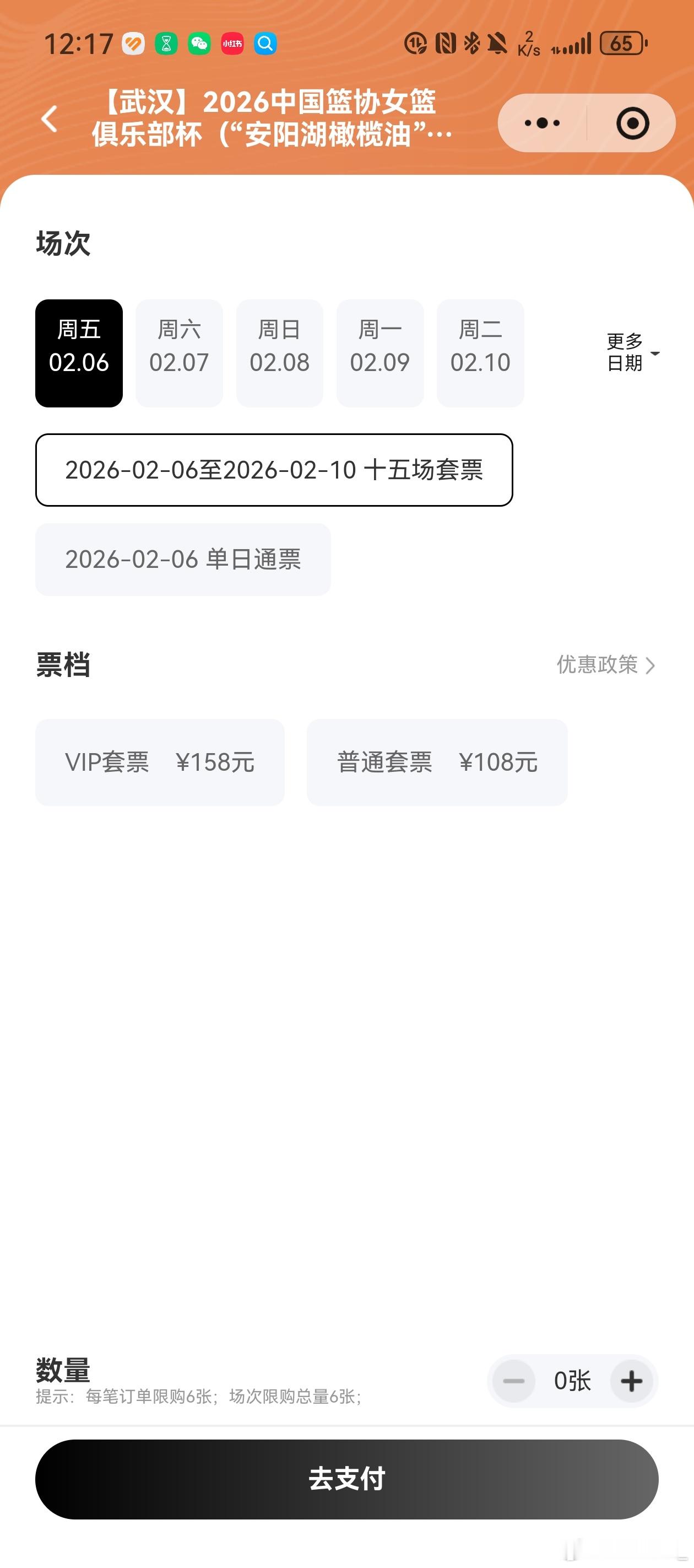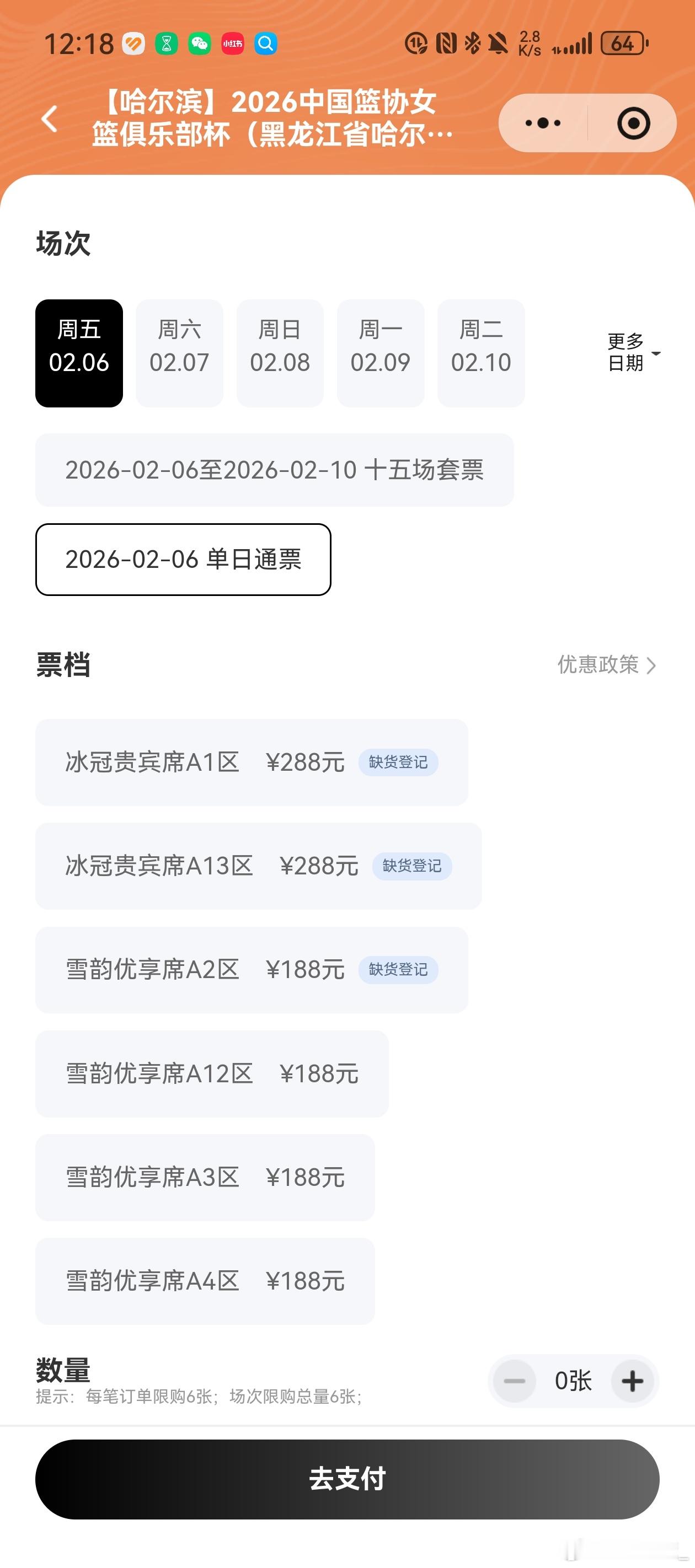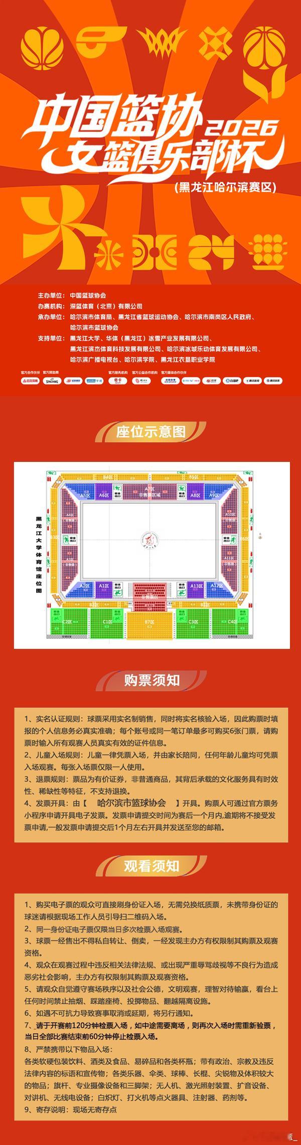 【千呼万唤始出来 wcba俱乐部杯观赛指南】2026年中国篮协女篮俱乐部杯第一阶段于2月6日至10日进行,赛区设在黑龙江哈尔滨、山东临沂和湖北武汉;第二阶段拟于3月2日至9日在广东清远举行。我爱女篮为大家整理了各赛区的购票观赛指南: 【黑龙江】 票务平台为“看个比赛”,分为单日通票和15场套票两大类,每类票又根据座位的区域不同做出价格的区分:单日通票为58-288元;15场套票为168-888元。 【武汉】 票务平台为“看个比赛”,分为单日通票和15场套票两大类,每类票又根据座位的区域不同做出价格的区分:单日通票为38-388元;15场套票为108-158元。 【临沂】 票务平台为“票星球”,仅设分为单日通票,根据座位区域不同价格为30-90元。 武汉赛区和哈尔滨赛现已开票,且哈尔滨赛区部分比赛日的部分区域的球票已售罄,临沂赛区暂时还是预售状态。想要现场观赛的球迷朋友们可持续关注各平台票务情况。探营WCBA球队wcba俱乐部杯