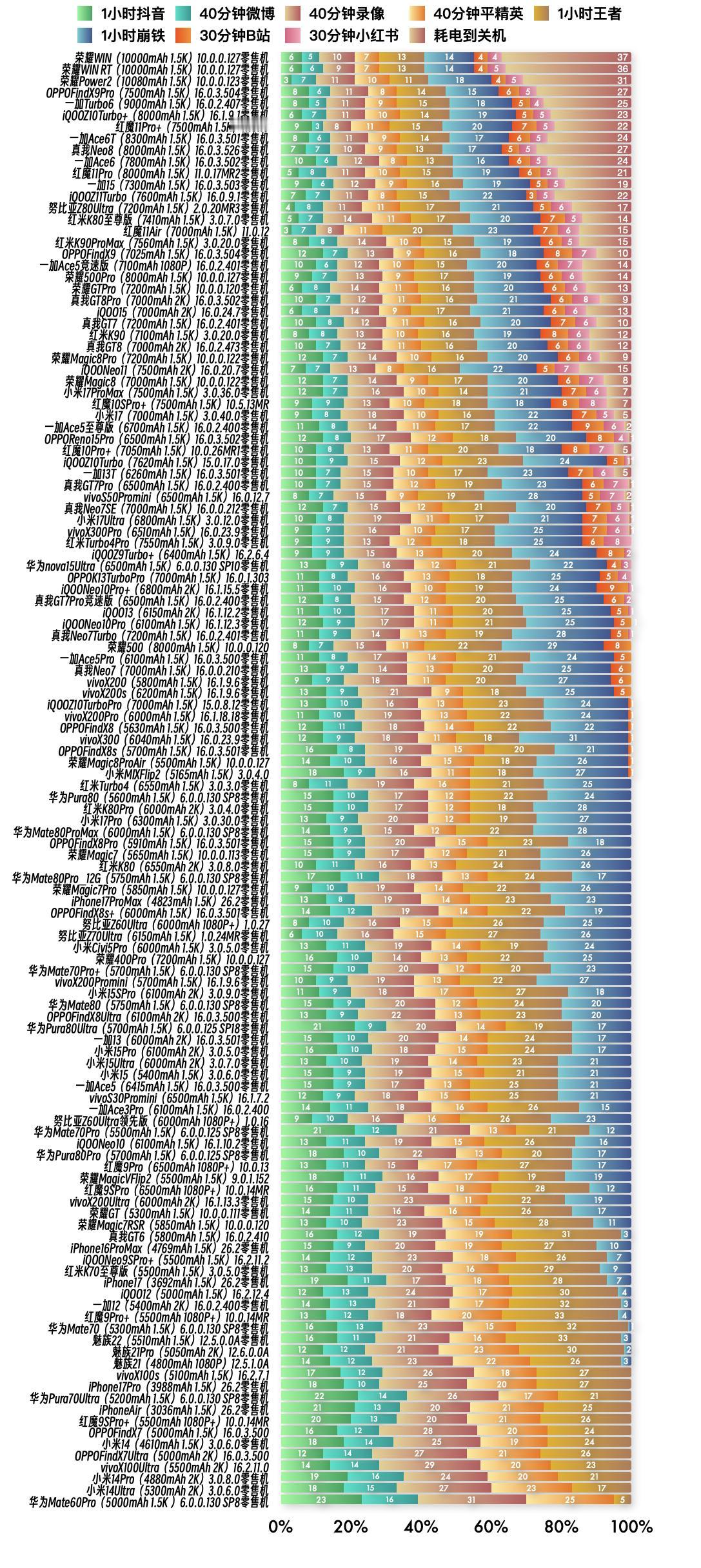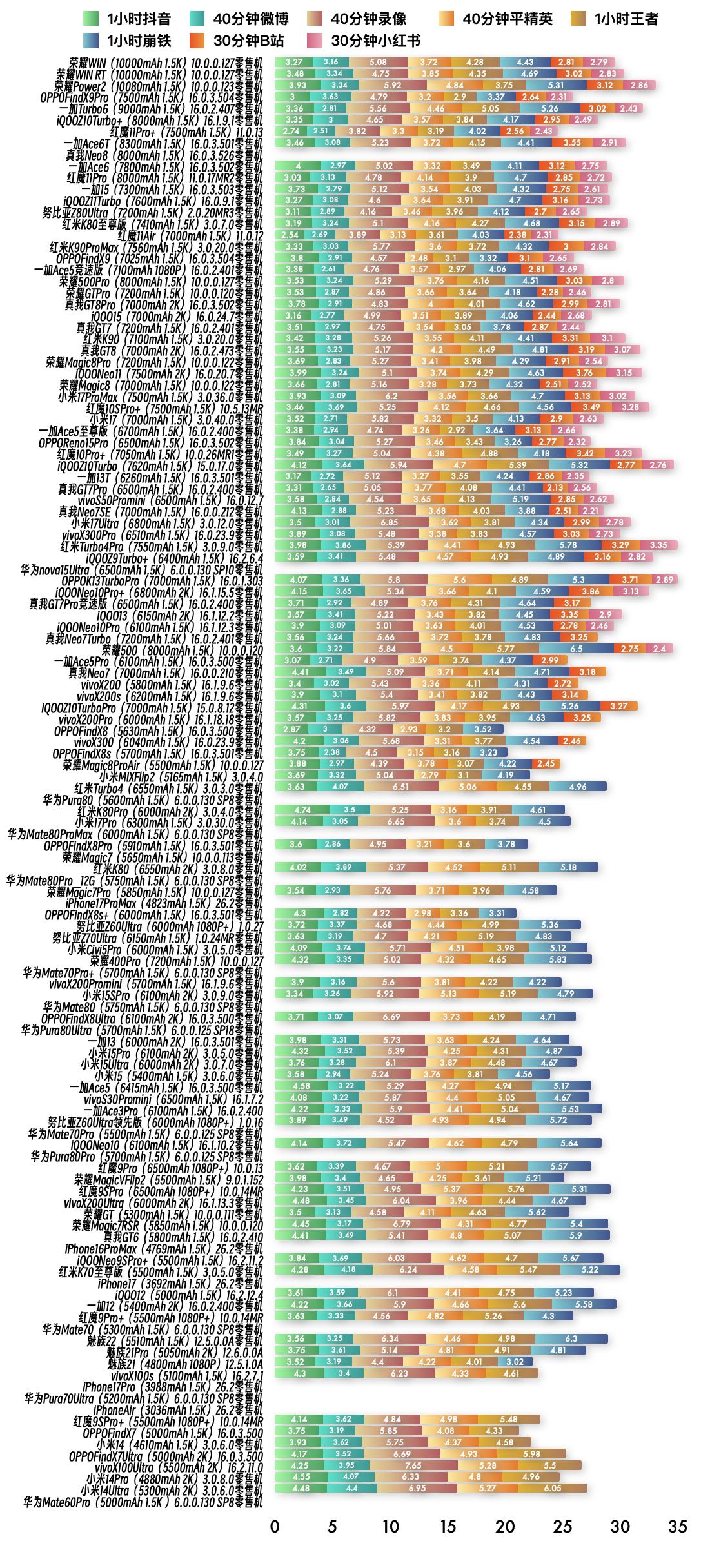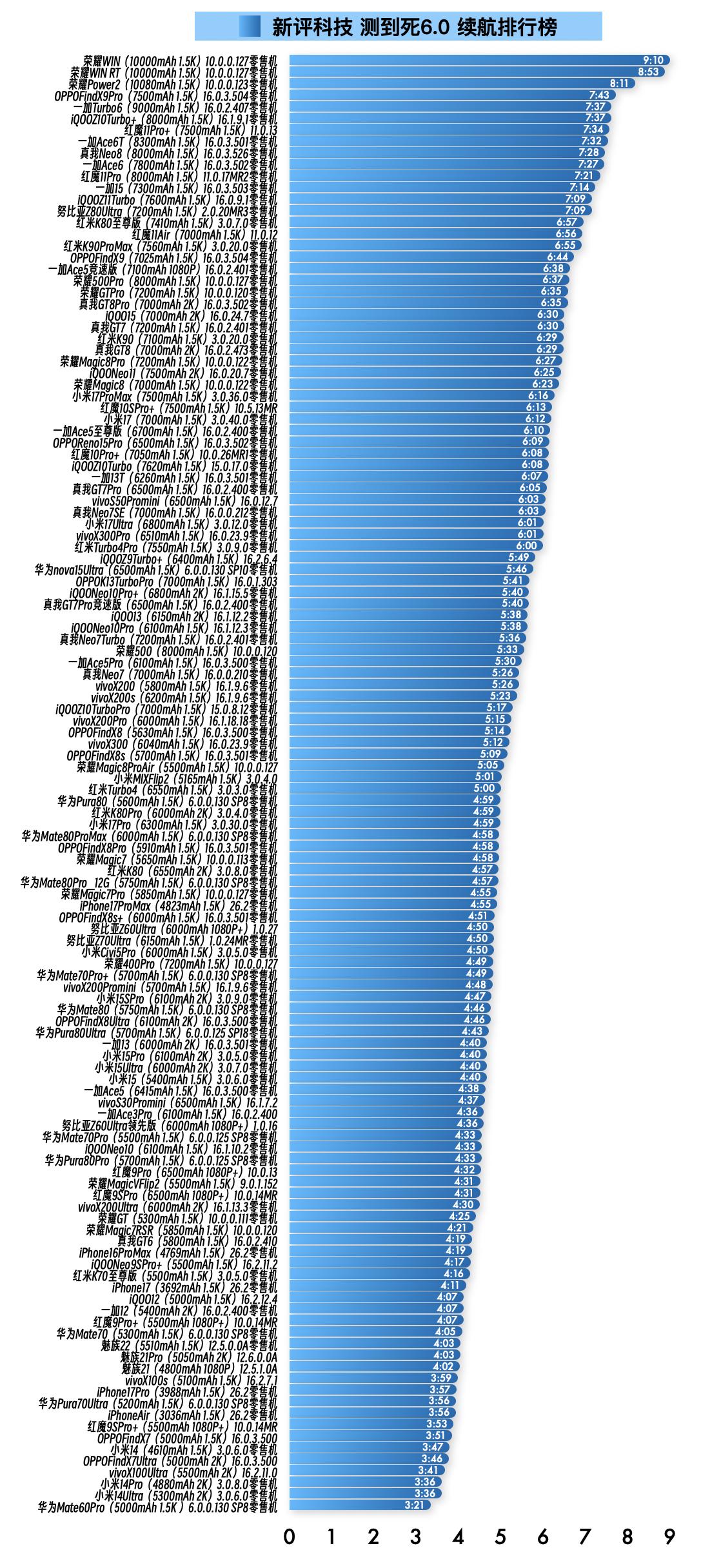 『2月4日最新手机续航榜单』 新评科技续航排行榜 本次6.0标准续航排行榜复测46台手机续航成绩;⭐️完整详细榜单请访问新评科技数据库小程序⭐️ 『6.0标准续航榜单』复测 ① 荣耀WIN零售机 第3次复测 10.0.0.127版本续航时间增加12分钟,总续航时间9小时10分钟,最新排名第1名【对比历史成绩续航增加】 ② 荣耀WIN RT零售机 第3次复测 10.0.0.127版本续航时间缩短6分钟,总续航时间8小时53分钟,最新排名第2名【对比历史成绩续航不变】 ③ 荣耀Power2零售机 第2次复测 10.0.0.123版本续航时间缩短7分钟,总续航时间8小时11分钟,最新排名第3名【对比历史成绩续航缩短】 ④ OPPOFindX9Pro零售机 第4次复测 16.0.3.504版本续航时间缩短2分钟,总续航时间7小时43分钟,最新排名第4名【对比历史成绩续航不变】 ⑤ iQOOZ10Turbo+零售机 第4次复测 16.1.9.1版本续航时间缩短7分钟,总续航时间7小时37分钟,最新排名并列第5名【对比历史成绩续航缩短】 ⑥ 一加Ace6T零售机 第3次复测 16.0.3.501版本续航时间缩短1分钟,总续航时间7小时32分钟,最新排名第8名【对比历史成绩续航不变】 ⑦ iQOOZ11Turbo零售机 第2次复测 16.0.9.1版本续航时间增加13分钟,总续航时间7小时09分钟,最新排名并列第13名【对比历史成绩续航增加】 ⑧ 红魔11Air 第2次复测 11.0.12版本续航时间增加12分钟,总续航时间6小时56分钟,最新排名第16名【对比历史成绩续航增加】 ⑨ 荣耀500Pro零售机 第4次复测 10.0.0.127版本续航时间增加4分钟,总续航时间6小时37分钟,最新排名第20名【对比历史成绩续航不变】 ⑩ 真我GT8Pro零售机 第4次复测 16.0.3.502版本续航时间增加6分钟,总续航时间6小时35分钟,最新排名并列第21名【对比历史成绩续航不变】 11 iQOO15零售机 第5次复测 16.0.24.7版本续航时间缩短7分钟,总续航时间6小时30分钟,最新排名并列第23名【对比历史成绩续航不变】 12 真我GT7零售机 第4次复测 16.0.2.401版本续航时间缩短9分钟,总续航时间6小时30分钟,最新排名并列第23名【对比历史成绩续航缩短】 13 vivoS50Promini 第3次复测 16.0.12.7版本续航时间无变化,总续航时间6小时03分钟,最新排名并列第39名【对比历史成绩续航不变】 14 小米17Ultra零售机 第3次复测 3.0.12.0版本续航时间增加7分钟,总续航时间6小时01分钟,最新排名并列第42名【对比历史成绩续航增加】 15 iQOOZ9Turbo+ 第3次复测 16.2.6.4版本续航时间增加9分钟,总续航时间5小时49分钟,最新排名第44名【对比历史成绩续航不变】 16 华为nova15Ultra零售机 第3次复测 6.0.0.130 SP10版本续航时间缩短9分钟,总续航时间5小时46分钟,最新排名第45名【对比历史成绩续航不变】 17 真我Neo7零售机 第3次复测 16.0.0.210版本续航时间增加8分钟,总续航时间5小时26分钟,最新排名并列第54名【对比历史成绩续航不变】 18 vivoX200Pro零售机 第3次复测 16.1.18.18版本续航时间增加1分钟,总续航时间5小时15分钟,最新排名第58名【对比历史成绩续航不变】 19 vivoX300零售机 第3次复测 16.0.23.9版本续航时间缩短9分钟,总续航时间5小时12分钟,最新排名第60名【对比历史成绩续航缩短】 20 OPPOFindX8s零售机 第2次复测 16.0.3.501版本续航时间缩短4分钟,总续航时间5小时09分钟,最新排名第61名【对比历史成绩续航不变】 21 荣耀Magic8ProAir 第2次复测 10.0.0.127版本续航时间缩短21分钟,总续航时间5小时05分钟,最新排名第62名【对比历史成绩续航缩短】 22 小米MIXFlip2 第2次复测 3.0.4.0版本续航时间增加6分钟,总续航时间5小时01分钟,最新排名第63名【对比历史成绩续航不变】 23 华为Pura80 第3次复测 6.0.0.130 SP8版本续航时间增加9分钟,总续航时间4小时59分钟,最新排名并列第65名【对比历史成绩续航增加】 24 华为Mate80ProMax零售机 第2次复测 6.0.0.130 SP8版本续航时间不变,总续航时间4小时58分钟,最新排名并列第68名【对比历史成绩续航不变】