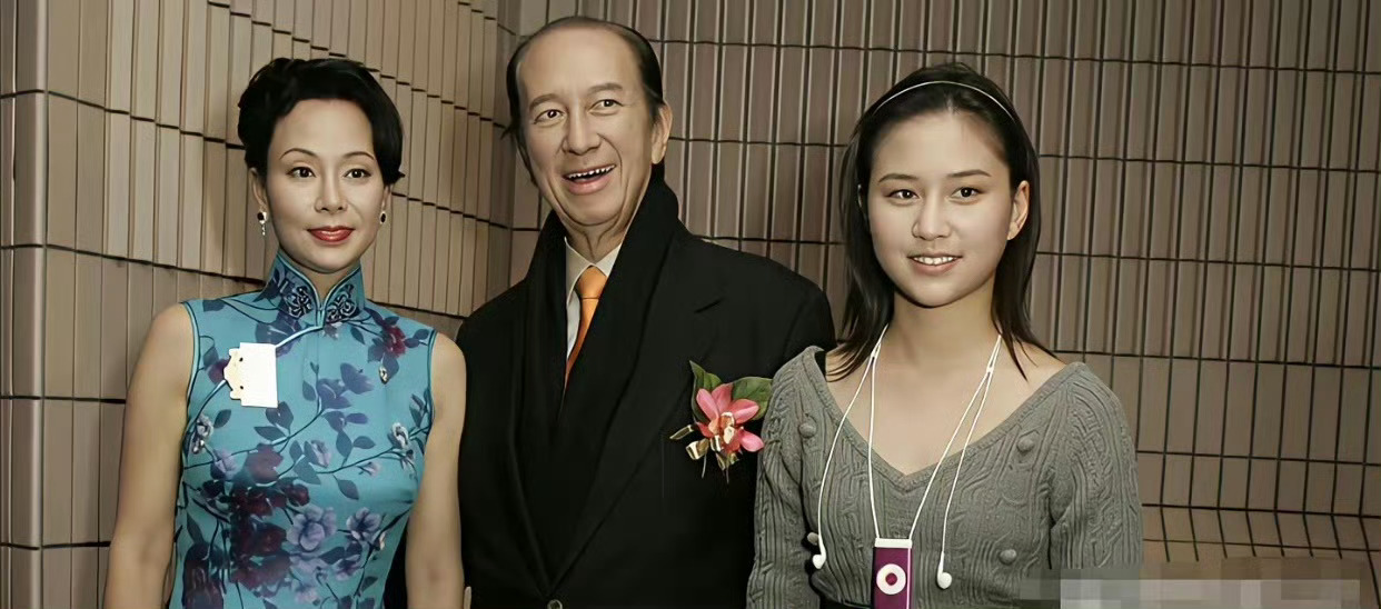 少女时期的何超莲,和爸爸赌王一起拍照,个子小小的,脸蛋圆圆的,看起来还没长开