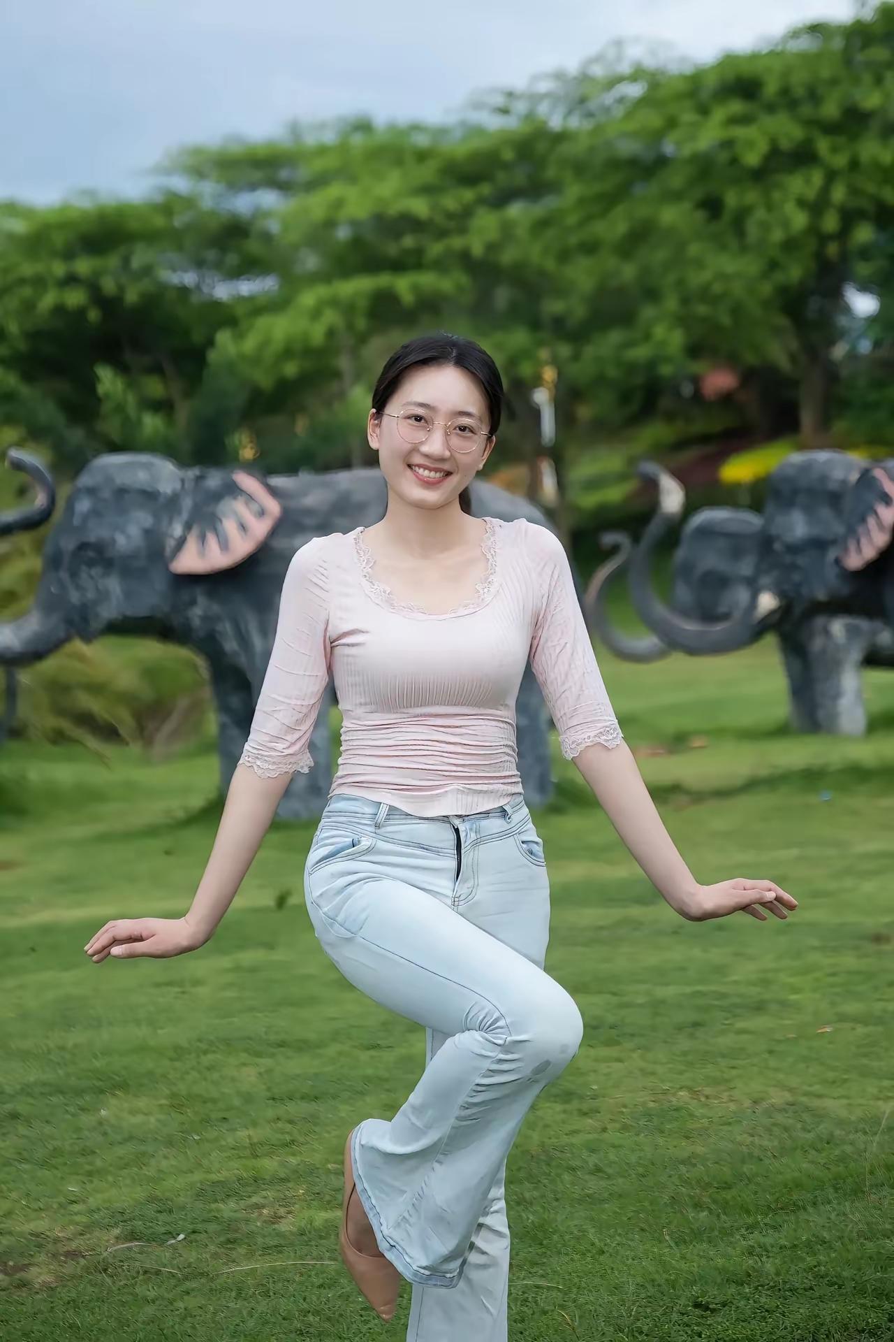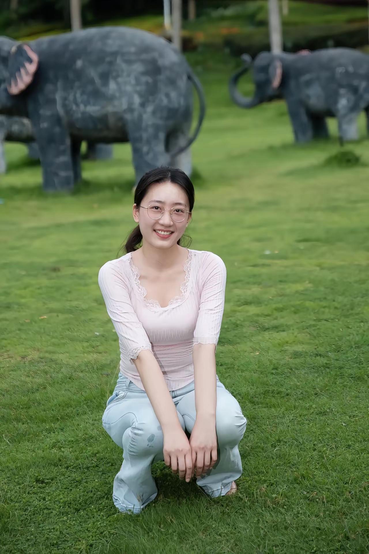 在绿意盎然的草地上,与大象雕塑合影,轻松自在的一天。🌿🐘😊