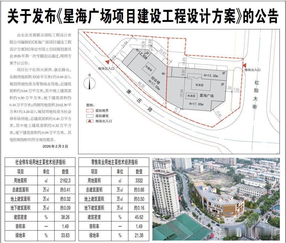 保定星海广场项目建设工程设计方案公布,项目约8.24亩,位于红阳大街西、康庄路北!东侧用地面积3332平方米(约5.00亩), 规划用地性质为零售商业用地,总建筑 面积约0.66万平方米,;西侧用地面积2162.30平 方米(约3.24亩),规划用地性质为社会 停车场用地,总建筑面积约0.41万平方米。