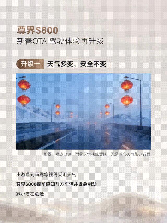 春节开车回家的幸福感,被尊界S800新春OTA直接拉满!新增功能藏满惊喜,车内外体验直接封神。解锁瞬间就被“马到成功”迎宾灯语戳中,动态投影搭配新春祝福,仪式感直接拉满,过年开出去回头率爆表。紫银双拼车色在阳光下超吸睛,AI分色技术果然名不虚传,搭配三种模式的智能星空顶,夜间乘车像置身银河,豪华感绝了。 交互体验更是惊艳,华为手表星闪配对的“捏捏开门”,轻轻一捏优雅解锁;后排新增“挥手关门”,对侧乘客不用起身就能关车门,尊贵又便捷。组队出行功能太适合全家自驾游,实时共享位置还能语音对讲,路上再也不怕走散。 安全方面直接拉满buff!华为乾崑智驾ADS 4.1太靠谱,高速、乡村路都能轻松应对,eAES防夹心、超视距预警让变道超车更安心。首发的爆胎不失稳、悬架预瞄防刮底功能,跑山路烂路也不怕,失能辅助SOS更是给生命安全多一层保障。HUD夜间增强功能,黑暗中也能清晰标注行人,夜间行车更放心。 尊界S800升级ADS4.1