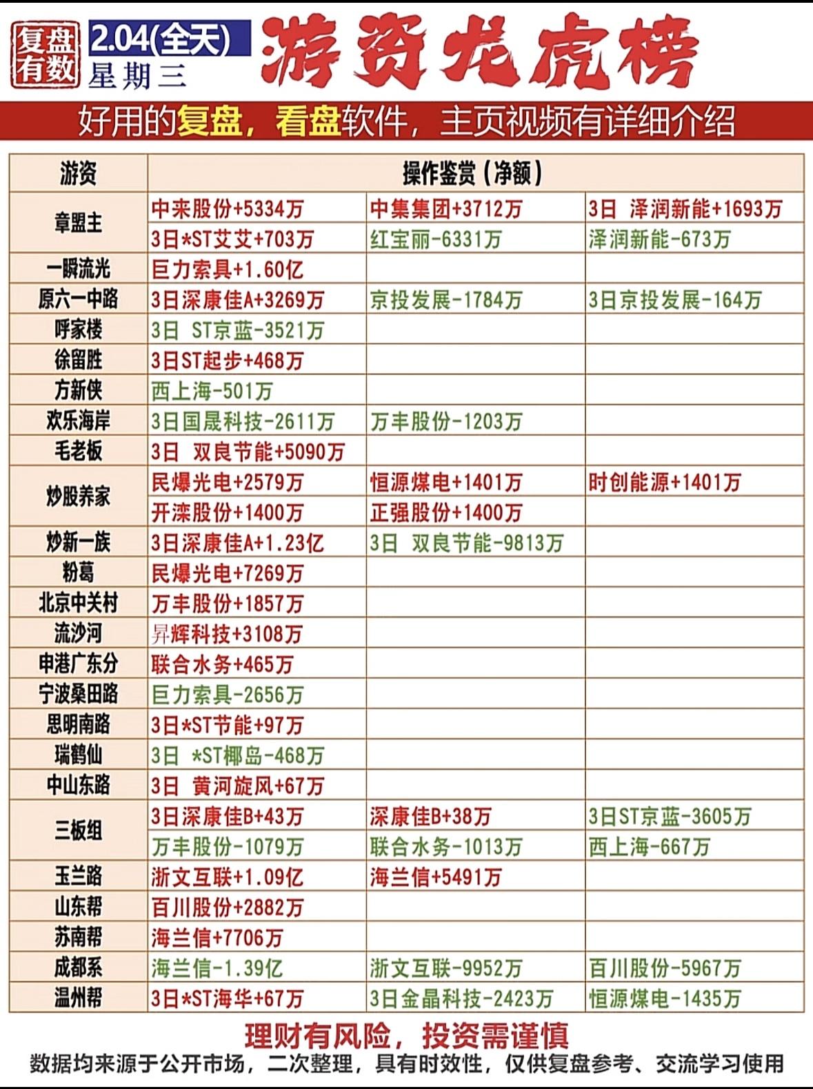 游资龙虎榜:2.04复盘,操作鉴赏,看盘软件详解! 游资动向:多股资金博弈,中