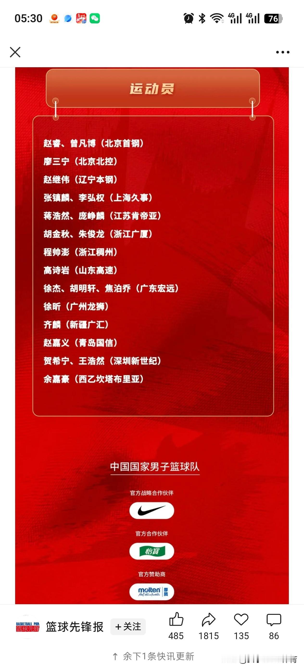 重点关注,中国🇨🇳男篮!世界杯预选赛临近,21人春节集训,准备“抗日” ★4人缺失,有点遗憾!此次集训,没有征召的国手有周琦、王岚嵚、李祥波、雷蒙。他们有的因为伤病,有的因为状态,有的因为与阵容不匹配。 ★新增8人,可喜可贺!对于徐昕、赵继伟、王浩然、李弘权、贺希宁、庞峥麟、徐杰、齐麟的入选,有人说是因为状态爆棚,也有人说是实至名归。 ★最佳12人,舍我其谁!中锋:胡金秋、余嘉豪、徐昕;前锋:张镇麟、朱俊龙、贺希宁、王俊杰;后卫:赵睿、赵继伟、程帅澎、廖三宁、徐杰。 中国男篮 男篮名单 男篮阵容