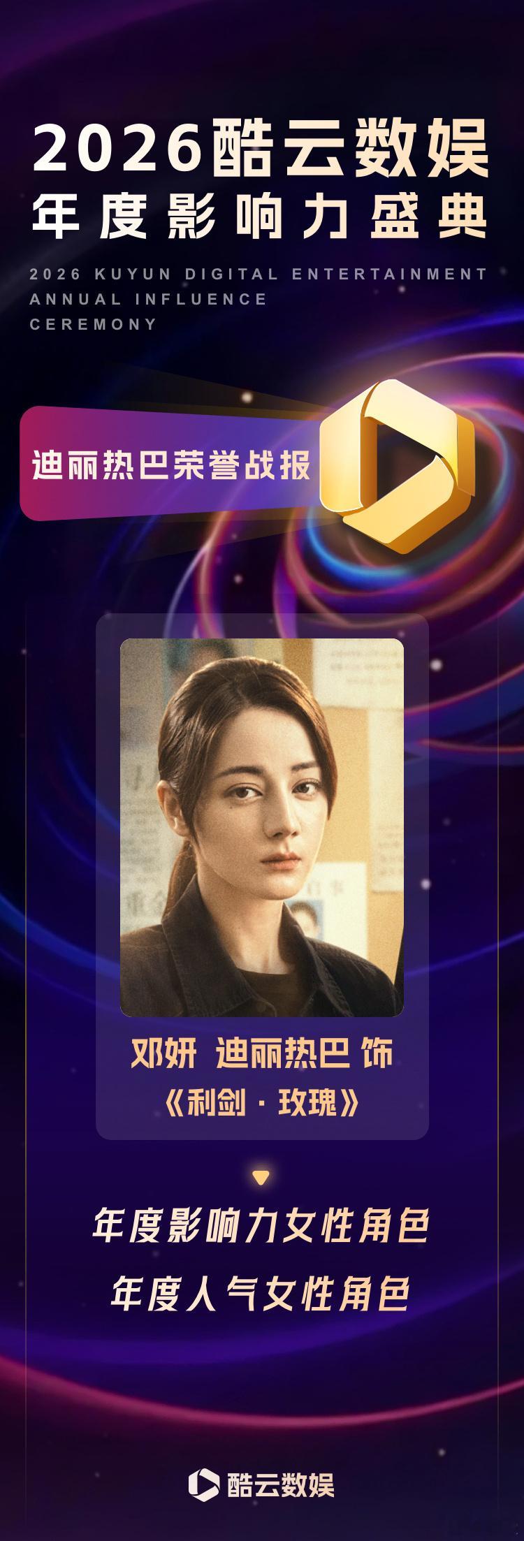 迪丽热巴《利剑玫瑰》邓妍角色获得酷云年度影响力女性角色、年度人气女性角色奖项,恭