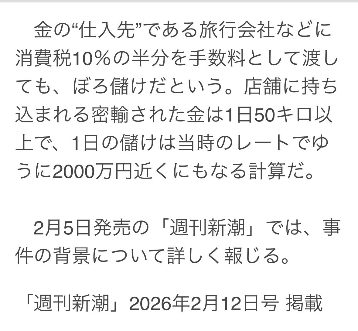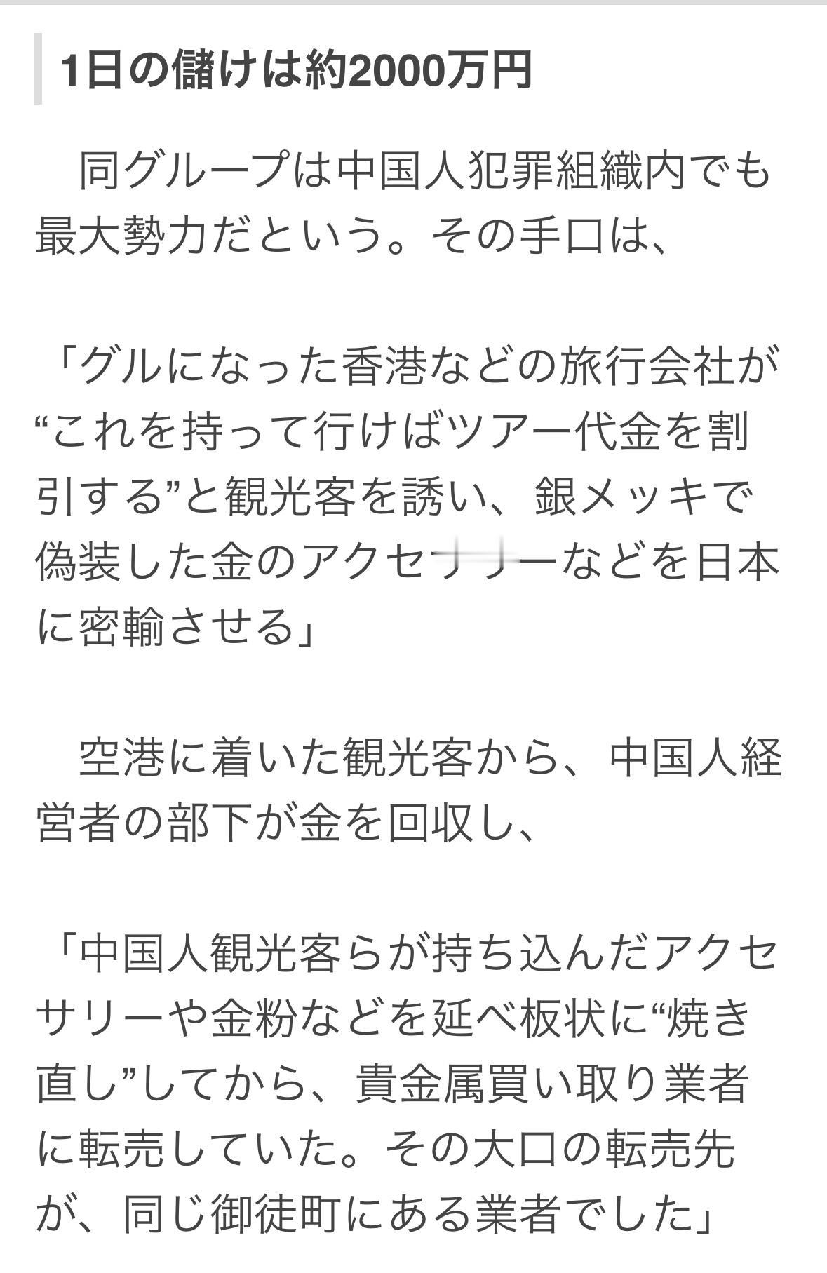 日赚2000万日元,该团伙是中国最大规模的犯罪组织,具体手法如下: 香港及其他国家的旅行社与游客勾结,承诺提供旅游折扣,然后将伪装成镀银物品的黄金走私到日本。中国经理的下属在游客抵达机场时收取这些黄金。 中国游客携带的首饰和金粉会被重新加热成金片,然后卖给贵金属买家。最大的买家是位于御徒町地区的金银商。 即使扣除10%消费税的一半作为佣金支付给旅行社等,他们仍然赚得盆满钵满。每天有超过50公斤的走私黄金被运进店里,按当时的汇率计算,每天的利润轻松达到近2000万日元。 上野、羽田、香港发生的一系列巨额抢劫案背后有内应,至今谜团未解,但可以肯定的是,与黄金交易相关的现金运输是他们的目标。真相的关键在于上野和御徒町一带活动的黄金走私据点。