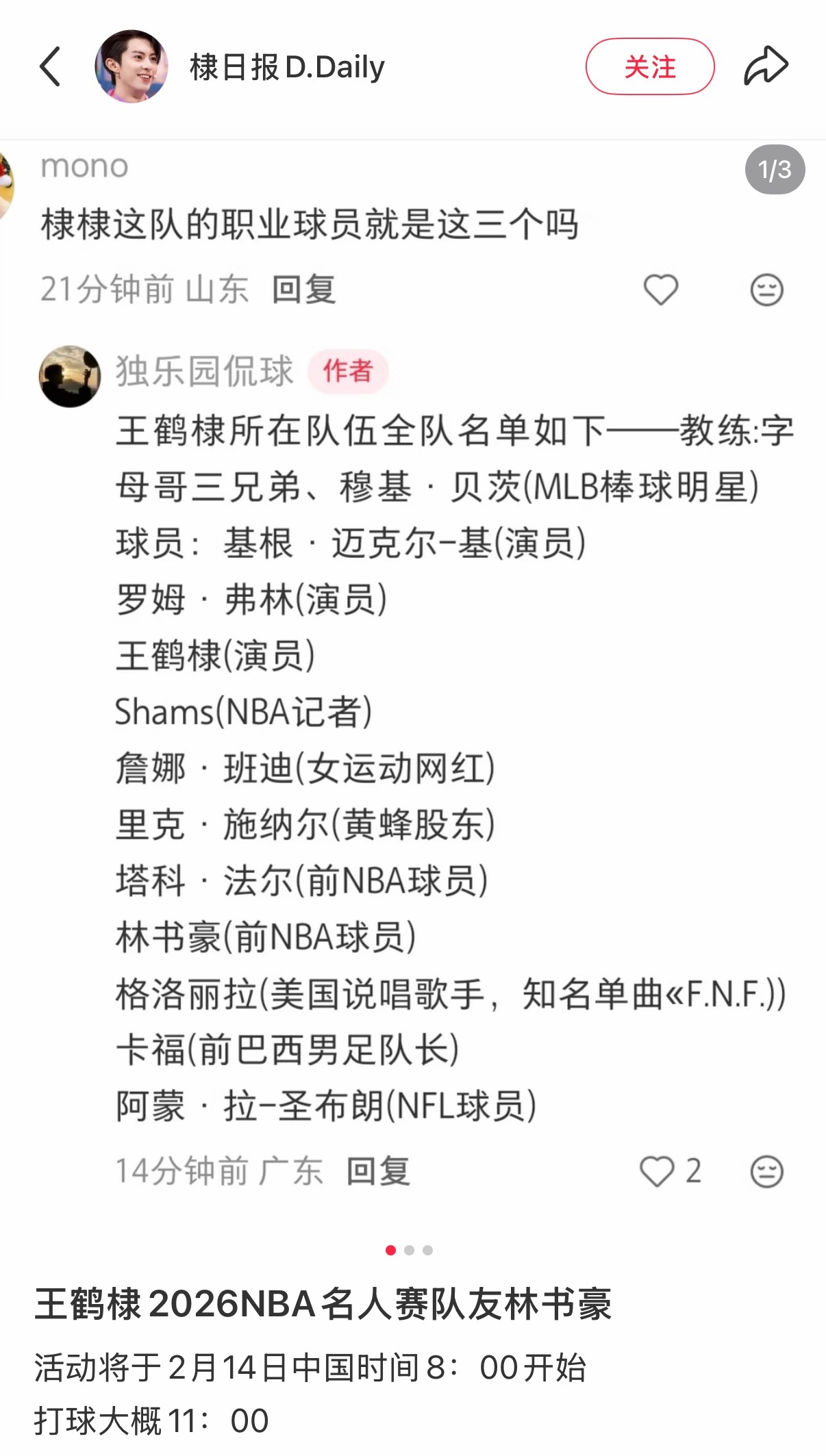 王鹤棣2026NBA名人赛队友林书豪活动将于2月14日中国时间8:00开始打球大概11:00Crp1