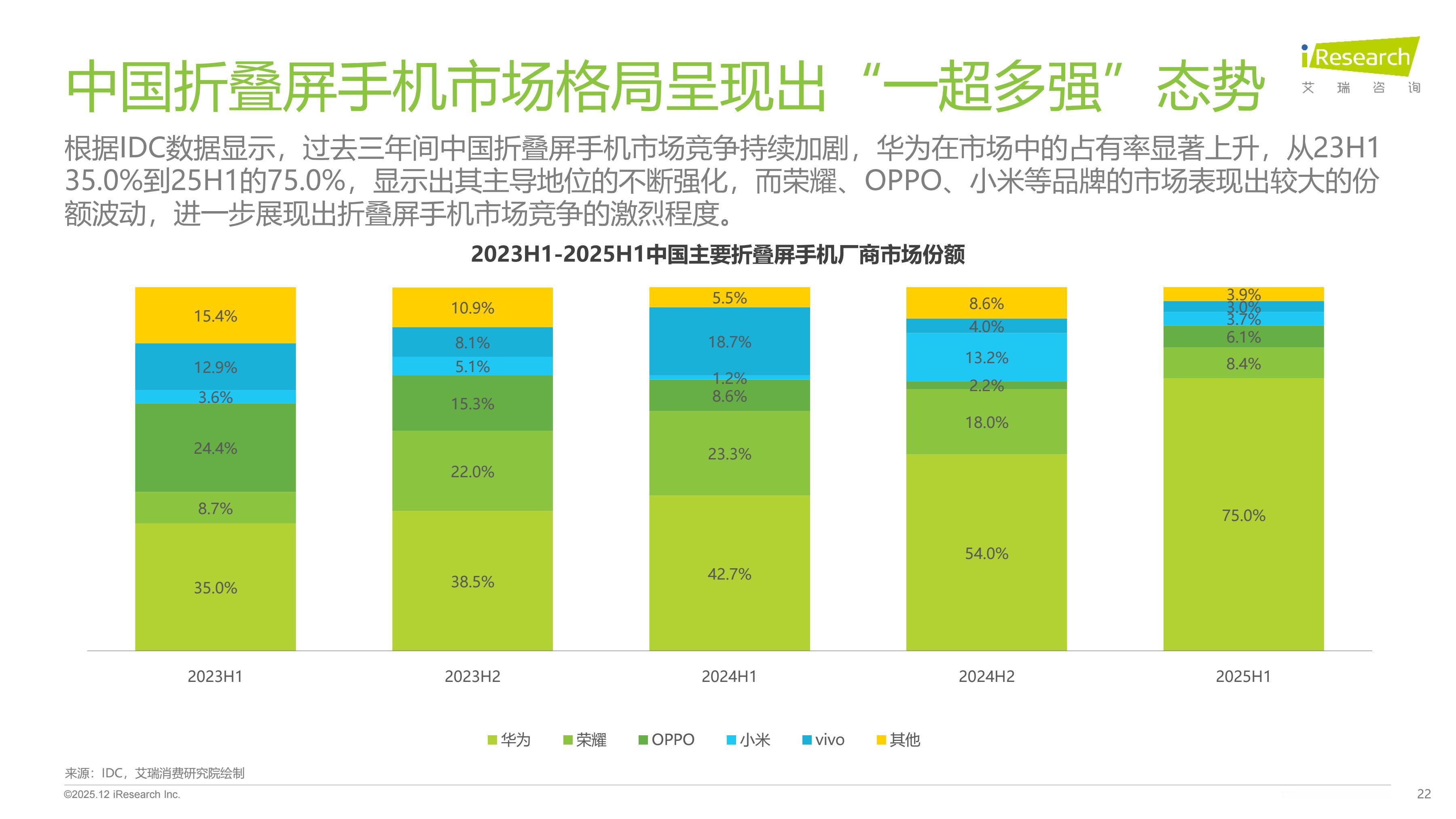 iPhoneFold来了国产机怕了吗别的不知道,华为肯定不带怕的!看IDC刚出的2025折叠屏数据,华为独占超7成份额、出货量跨过千万大关,这实力确实有点“不讲道理”了!很多人只看到这千万级的爆发,但深耕七年的耐力才是底色。从外折、内折、小折到三折、阔折叠,华为这套“全形态布局”基本把路都走全了。特别是去年首创的“阔折叠”,今年看趋势也要成行业标配了。说实话,折叠屏赛道现在更像是一场“跟跑赛”。华为在前面趟平技术无人区,大家在后面跟进成熟形态。现在来看,能超越华为的,可能真的只有下一个阶段的华为了。 国内折叠市场迎来巨震