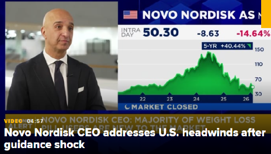 杜斯达在接受CNBC采访时强调,公司核心减重药物韦戈维(Wegovy)在美国面临大幅降价的不利因素。他表示:“大家要做好准备,股价先跌后涨。我们并未详细说明这一影响的具体幅度,只是给出了当前指引的区间。”