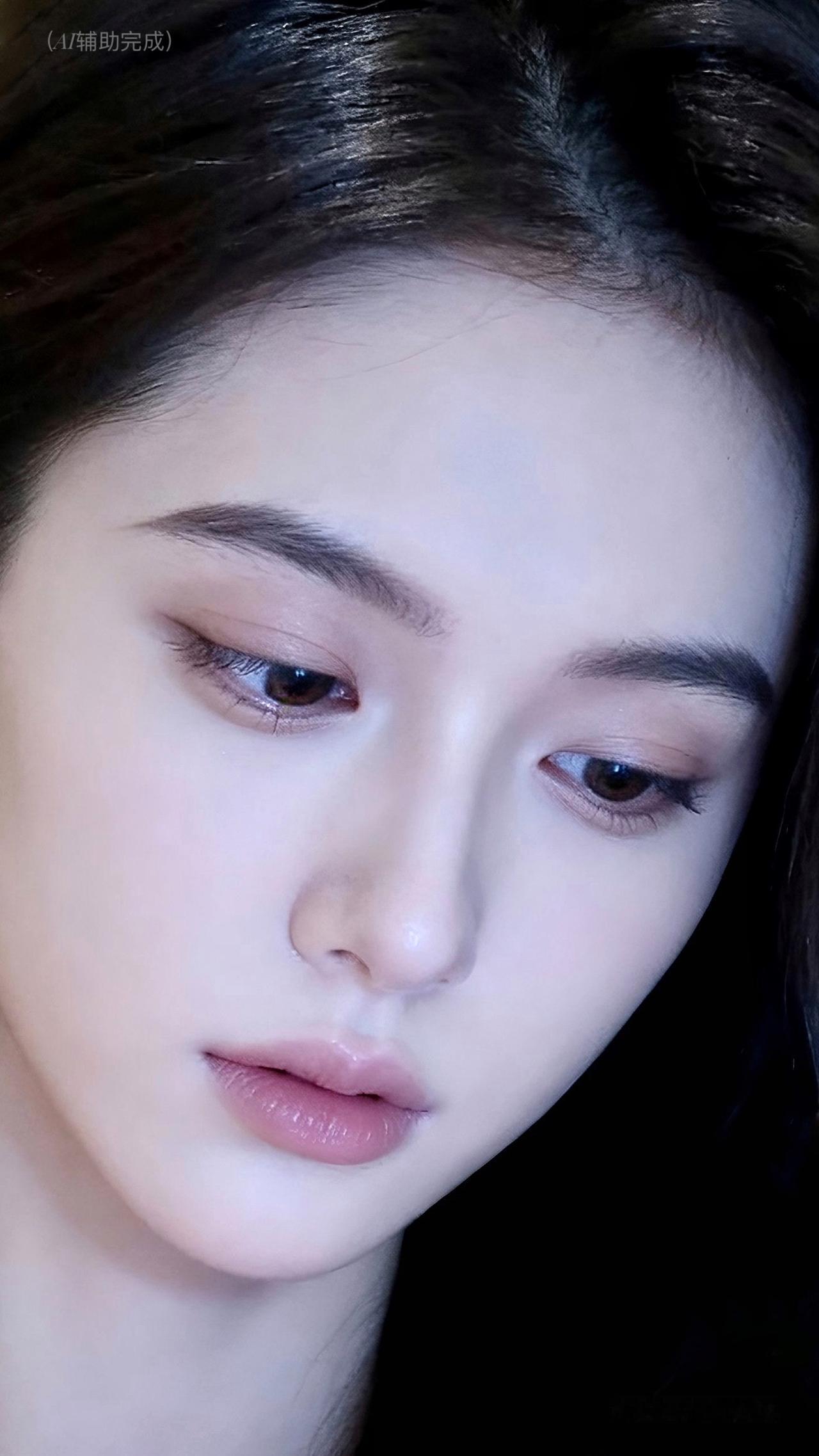 乌发如绸垂落泛柔光,白皙透润似玉。琥珀棕眸低垂藏温柔,睫卷纤长若蝶翼,挺鼻樱唇粉