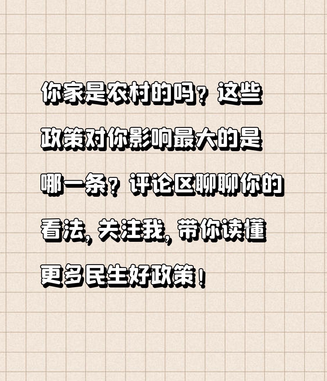 中央一号2026中央一号文件划重点!农民的地、钱、房全有新规定,关系每个人 家人们注意了!2026年中央一号文件正式发布,这可是连续14年聚焦“三农”的重磅政策!里面藏着农民最关心的地怎么种、钱怎么赚、日子怎么过的答案,而且很多规定颠覆认知,不管你是农村人还是城里人,都和你息息相关,赶紧收藏起来慢慢看! 先说说大家最关注的土地问题!之前总有人担心“土地流转会不会被强制”,这次文件直接定调:承包地流转必须农民说了算,不准下指标、定任务,更不能硬把农民挤出土地!以后谁再敢强行推动流转,直接纠正查处。更让人安心的是,第二轮土地承包到期后,全面开展再延长30年的整省试点,绝大多数农户的承包地保持稳定,再也不用怕“地没了”。 但这里有个关键转折:土地不是不能流转,而是要“依法自愿有偿”。文件鼓励发布流转价格指数,防止流转费太低亏了农民,也避免太高影响农业竞争力。同时明确红线:耕地不能搞“非农化”,像“大棚房”、挖湖造景、乱占耕地建房这些行为,露头就打!另外,今年粮食产量要稳定在1.4万亿斤左右,种粮补贴继续发,玉米大豆、稻谷补贴政策不变,耕地地力保护补贴也稳稳的。 再看农民增收的新路子!别以为只能靠种地,文件明确了3个赚钱方向:一是主产区要建粮食加工厂,把就业机会留在农村,让农民既能收粮又能打工;二是乡村旅游要搞“小而美”,不搞大拆大建,靠本地民俗、农耕文化吸引游客,避免同质化竞争;三是继续巩固肉牛、奶牛产业纾困成果,帮养殖户降低成本、应对市场风险。更重要的是,过渡期结束后,帮扶政策不“急刹车”,会建立常态化机制,守住不发生规模性返贫的底线。 还有农村教育和住房的好消息!之前有些地方盲目撤并中小学,导致偏远地区孩子上学难,这次文件要求“稳慎优化”布局,避免一刀切,既要保障教育公平,也要留住乡村的烟火气。在乡村建设上,不搞“千村一面”,而是按集聚提升、城郊融合、特色保护、搬迁撤并四类村庄分类发展,让农村既有现代生活,又保留原始风貌。 可能有人觉得“三农”政策只和农民有关,其实不然!粮食安全关系每个人的饭碗,农产品涨价、食材安全都和一号文件紧密相关;乡村变美了,我们多了休闲度假的好去处;农民收入提高了,城乡差距缩小了,整个社会更和谐。可以说,乡村振兴不是农村的事,而是全民的事。 说到底,这篇一号文件的核心就是让农民“地有保障、钱有来路、日子有奔头”。从土地延包30年到种粮补贴稳定,从就业增收渠道拓宽到乡村环境改善,每一条都说到了老百姓的心坎里。农村稳则天下安,农业兴则基础牢,希望这些好政策能落地生根,让农村越来越美,农民越来越富,让我们一起期待乡村全面振兴的美好未来! 你家是农村的吗?这些政策对你影响最大的是哪一条?评论区聊聊你的看法,关注我,带你读懂更多民生好政策!文件扱筒版