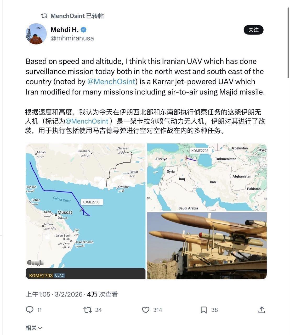 大概率,美国不敢打了! 美军CVN-72林肯航母舰队,已经处于伊朗的打击范围内,随时遭到火力覆盖。 1月28号开始,伊朗就不断起飞长航时无人机,侦查美军航母的踪迹! 其中2月3日,伊朗至少往阿曼湾起飞了三次无人机!另外还起飞了一架770公里时速的喷气式无人机,进行侦查。 然后,即使是被美军击落一架沙赫德-129后,马上又起飞了第二架继续侦查。 冷战期间,美军即使面对苏联贴着航母而过的侦察机,都不开火只驱离! 另外,伊朗的大摩托无人机,大概低于10万美元一架,而美军的拦截弹珍贵,AIM 9x格斗弹至少50万美元,如果用了120D中距离弹,则要300万美元。 这种高强度侦查表明,林肯号航母舰队已经不断遭到袭扰,从某种角度来说,航母被发现基本宣告“被击沉”,已经不能保证100%安全! 美国最难以承受的是,伊朗再次打出200枚导弹的齐射!这些导弹有了定位和引导,一旦开战,林肯号可就危险了。 可以这么说,航母只要挨一发伊朗的子弹,老美都得输。