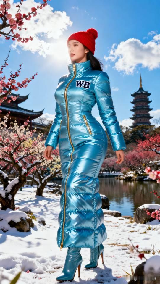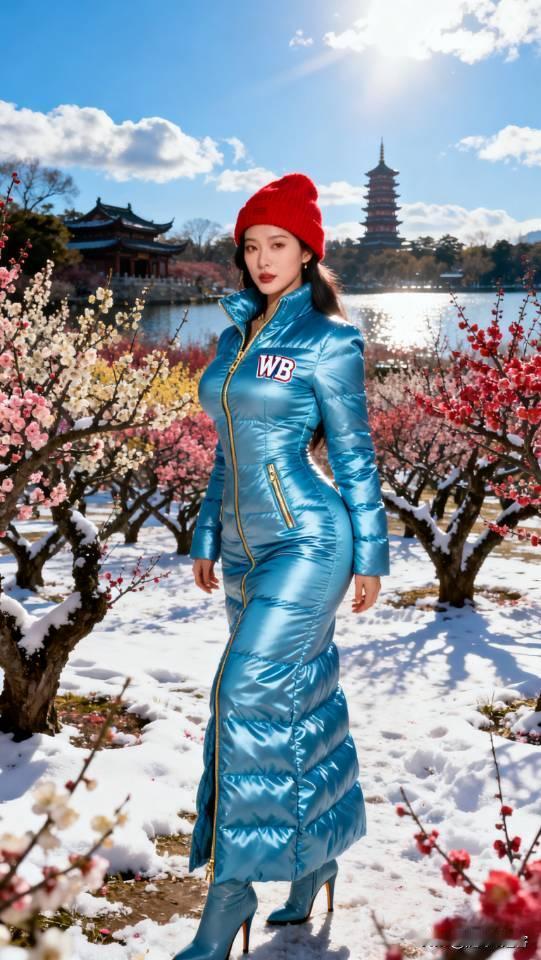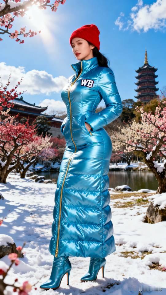 身穿蓝色羽绒服的女子在桃花园摆拍。长款羽绒服 美女壁纸