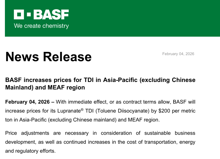 2026年2月4日,巴斯夫宣布自即日起(或在合同条款允许的情况下),上调亚太地区(不含中国大陆)及MEAF地区的Lupranate®TDI(甲苯二异氰酸酯)价格,涨幅为200美元/吨。