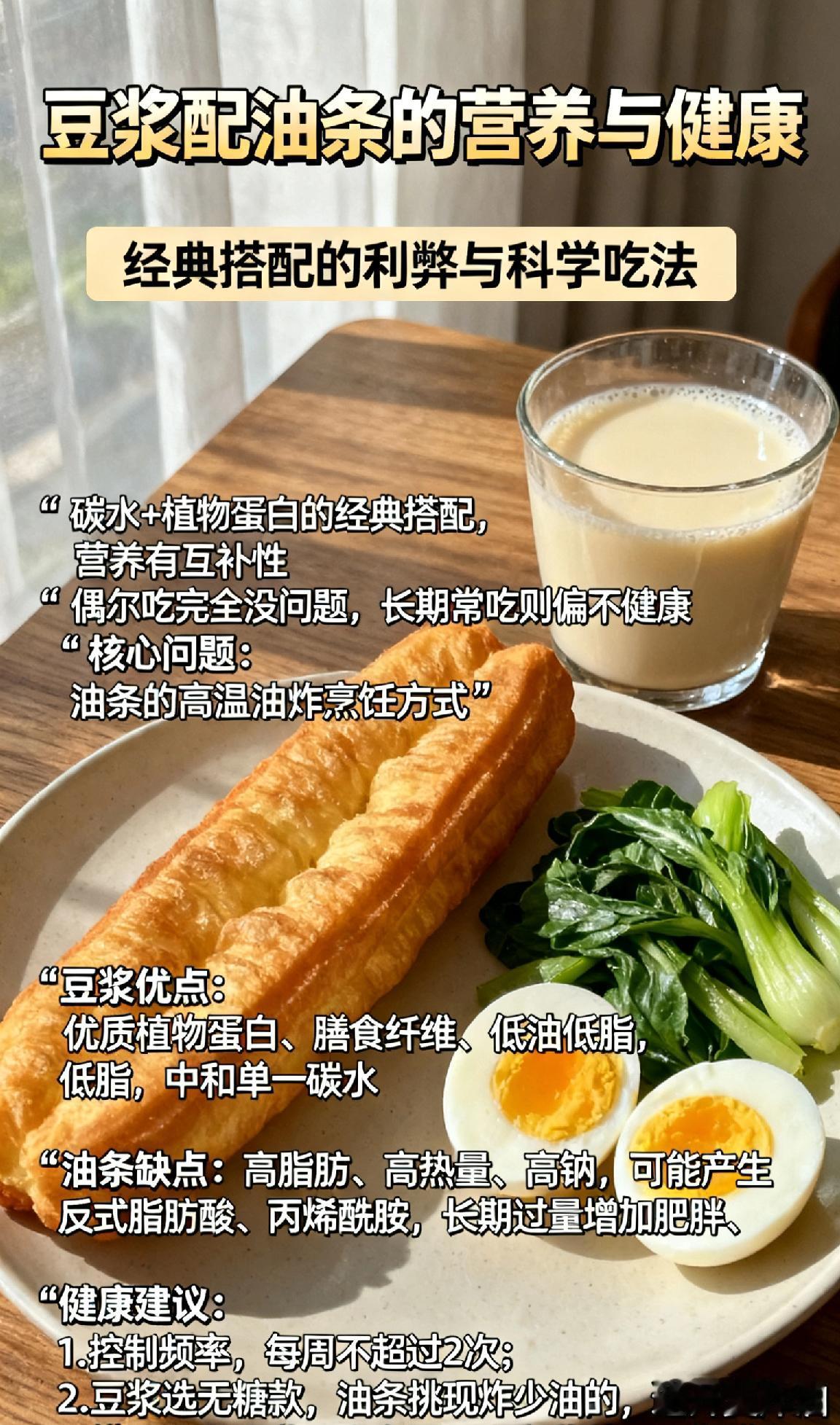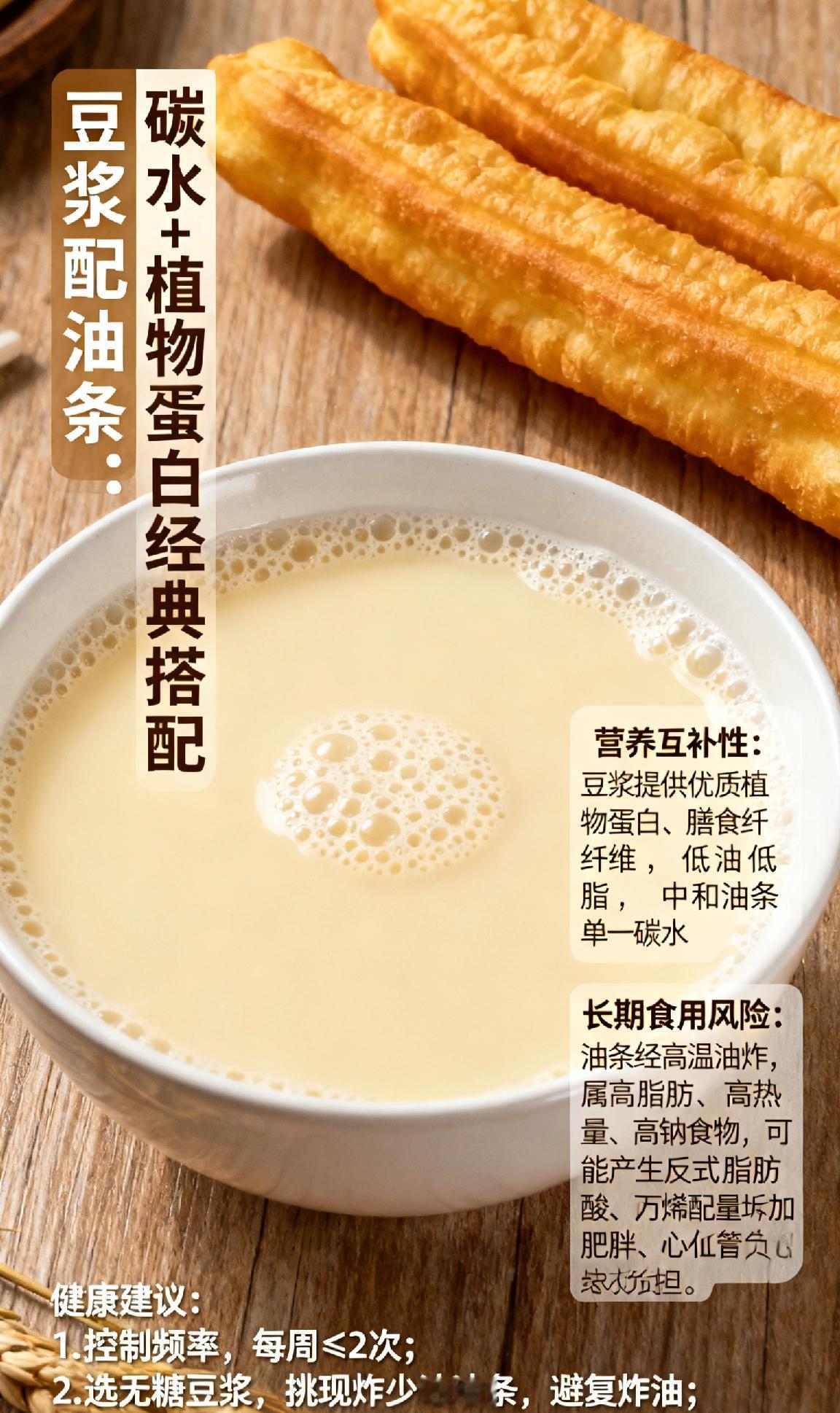 豆浆配油条到底健不健康豆浆配油条是碳水+植物蛋白的经典搭配,营养有互补性,偶尔吃完全没问题,长期常吃则偏不健康,核心问题出在油条的烹饪方式。 豆浆能提供优质植物蛋白、膳食纤维,低油低脂,中和油条的单一碳水;但油条经高温油炸,属于高脂肪、高热量、高钠食物,还可能产生反式脂肪酸、丙烯酰胺,长期过量吃易增加肥胖、心血管负担风险。 健康吃的小建议 1. 控制频率,每周食用不超过2次 2. 豆浆选无糖款,油条挑现炸少油的,避开复炸油 3. 搭配小份青菜、水煮蛋,丰富营养,平衡膳食养生豆浆食谱 鲜豆浆油条