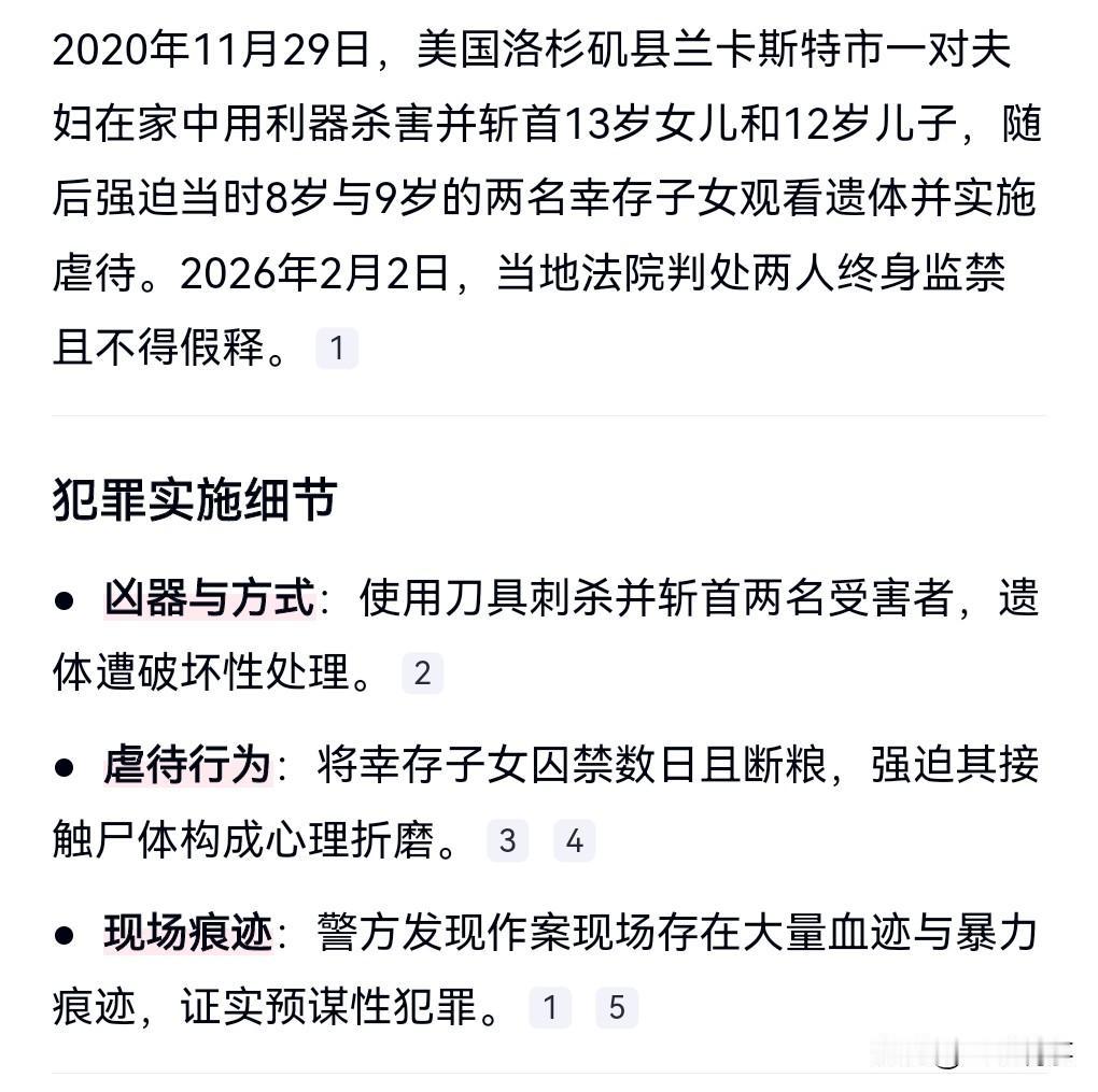 这真是太丧心病狂了吧,简直是泯灭人性啊。 2020年11月29日,美国夫妻斩首两名亲生子女,并且还强迫另外两名幸存的子女观看遗体并虐待。 感觉这两个人如果是心理变态了,竟然干出这种事情。 2月2日,两人被判终身监禁,且不得假释。