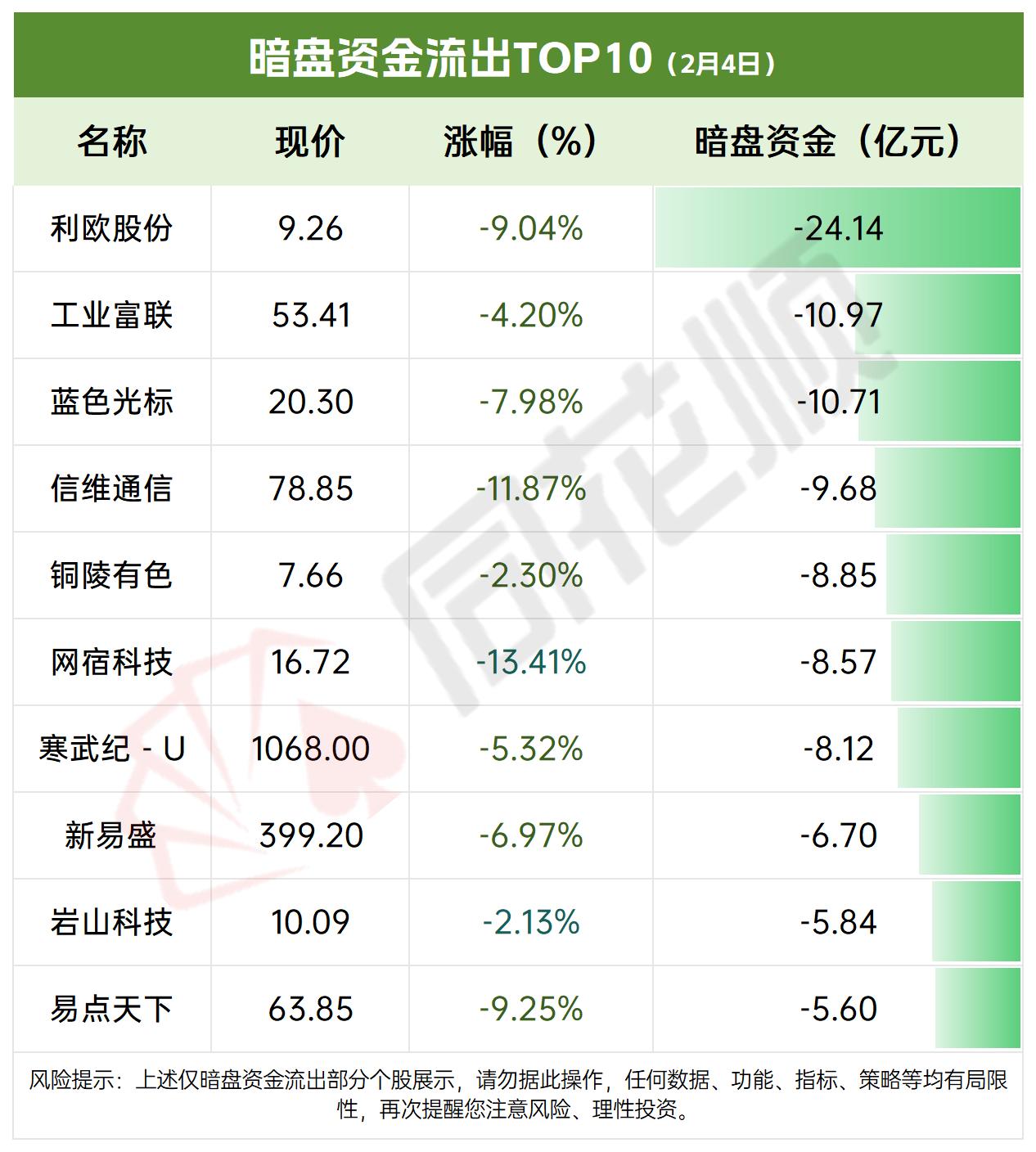2月4日,周三A股暗盘主力资金流入一览表!!! 主力资金大幅流出333.8亿,