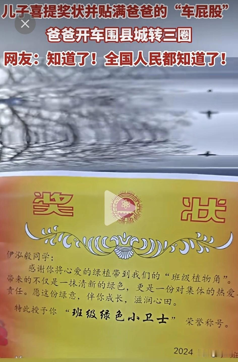 儿子喜提奖状,糊满老爸车屁股!老爸开车绕城三圈炫娃:我儿优秀藏不住!全国网友纷纷发来贺电!!! 最近有个老爸火遍了全网——因为他干了一件让全县城都知道他家娃优秀的事儿! 如今的家长们,炫娃早就不满足朋友圈了,都炫出新高度了! 一学期结束了,带着“战利品”回家的娃们,都趾高气昂,一个个都能走出六亲不认的步伐。 山东淄博,有这么一个宝贝疙瘩在学校喜提奖状,高兴得不得了。然后,灵机一动,还想出了一个“绝妙”的主意:把奖状一张一张,整整齐齐贴在了自家汽车的车屁股上! 好家伙,这一贴可不得了。老爸一看,非但没生气,反而乐得合不拢嘴。直接发动车子,开着这辆“奖状荣誉车”,绕着县城整整转了三圈! 想象一下那画面:一辆小车开过大街小巷,车屁股上红艳艳的奖状随风“招展”,过路的行人、等红灯的司机、街边小店里的老板,全都看得清清楚楚。 网友笑疯了: “叔叔,低调点!我们全县都知道了!” “这是生怕隔壁老王不知道他家孩子优秀啊” “建议全国巡展,不能光让咱县城群众羡慕” “孩子:爸,其实贴一张就行…爸:不!这些都得贴上!” “安徽人在辽宁送来祝福!” “实力不允许低调!” “广东省客家人发来贺电!” “下次孩子考试前:儿啊,多考几张,爸车还有一面是空的!” 这波操作为啥这么暖? [赞]老爸的骄傲藏不住——最好的爱就是“我娃真棒,我要让全世界知道”; [赞]孩子的成就被放大——这张奖状在爸爸心里,比什么都珍贵; [赞]幽默的家庭教育——用搞笑的方式肯定孩子,比单纯说“你真棒”更走心! 弱弱的提醒一句,炫娃可以,安全第一!贴奖状别挡车牌和车窗,高兴之余别忘了遵守交规哟~ 素材来源:淄博日报,侵联删