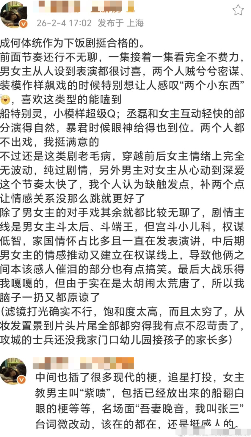王楚然丞磊《成何体统》repo,一方说剧情烂,宫斗低智,家国情怀过多;一方说花哨版太子妃升职记,节奏演员都不错。这是真业内,还是真宣传。到底信谁的?