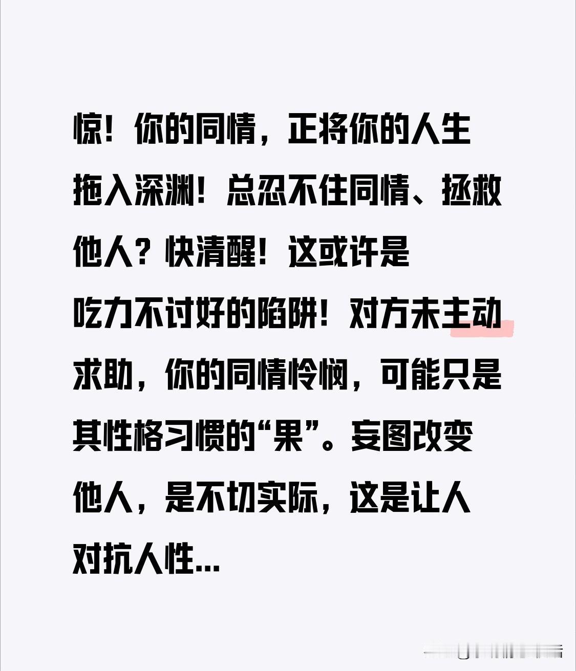 惊!你的同情,正将你的人生拖入深渊! 总忍不住同情、拯救他人?快清醒!这或许是吃力不讨好的陷阱! 对方未主动求助,你的同情怜悯,可能只是其性格习惯的“果”。妄图改变他人,是不切实际,这是让人对抗人性,只会引发抵触。 成人世界,各有命运。尊重他人,莫让同情心害了自己。 你因同情吃过亏吗?评论分享,点赞收藏,学会自保! 真心开导你的人 对同情心的思考
