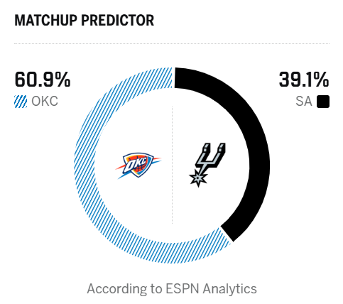 ESPN预测明日比赛:雷霆胜率60.9%,马刺胜率39.1%