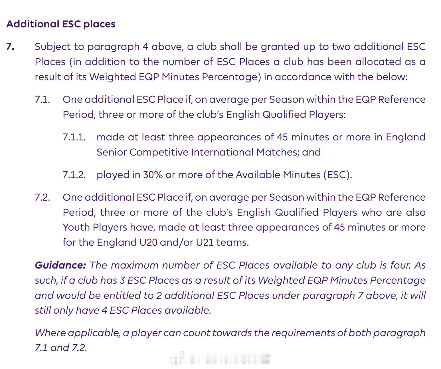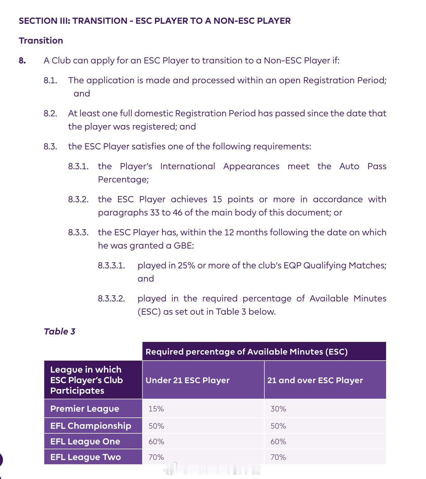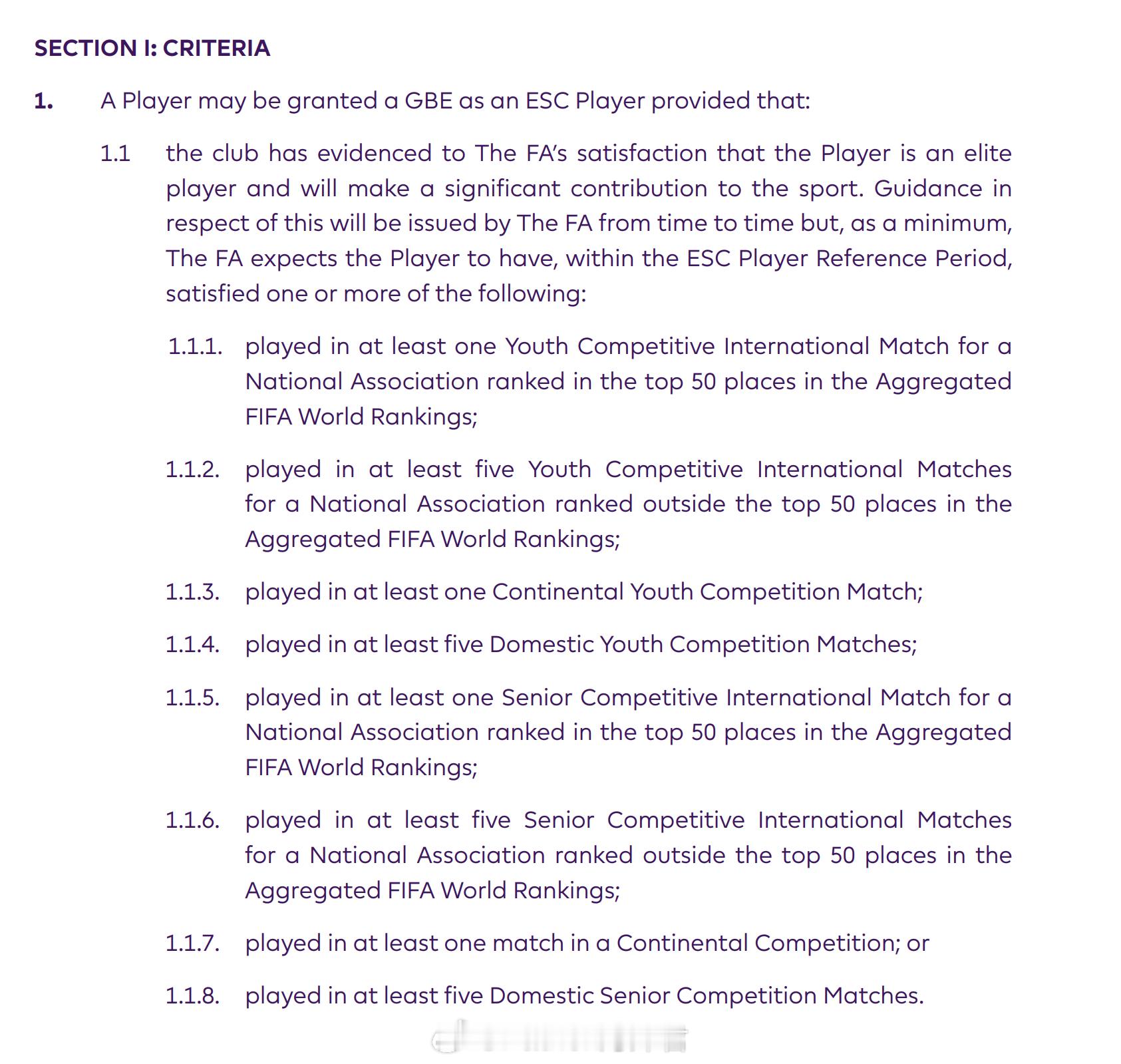 尽管没有明确的积分制系统,但申请ESC名额的球员还是有最基本的门槛。作为最低要求,英足总期望球员在参考期内,至少满足以下一项或多项条件: