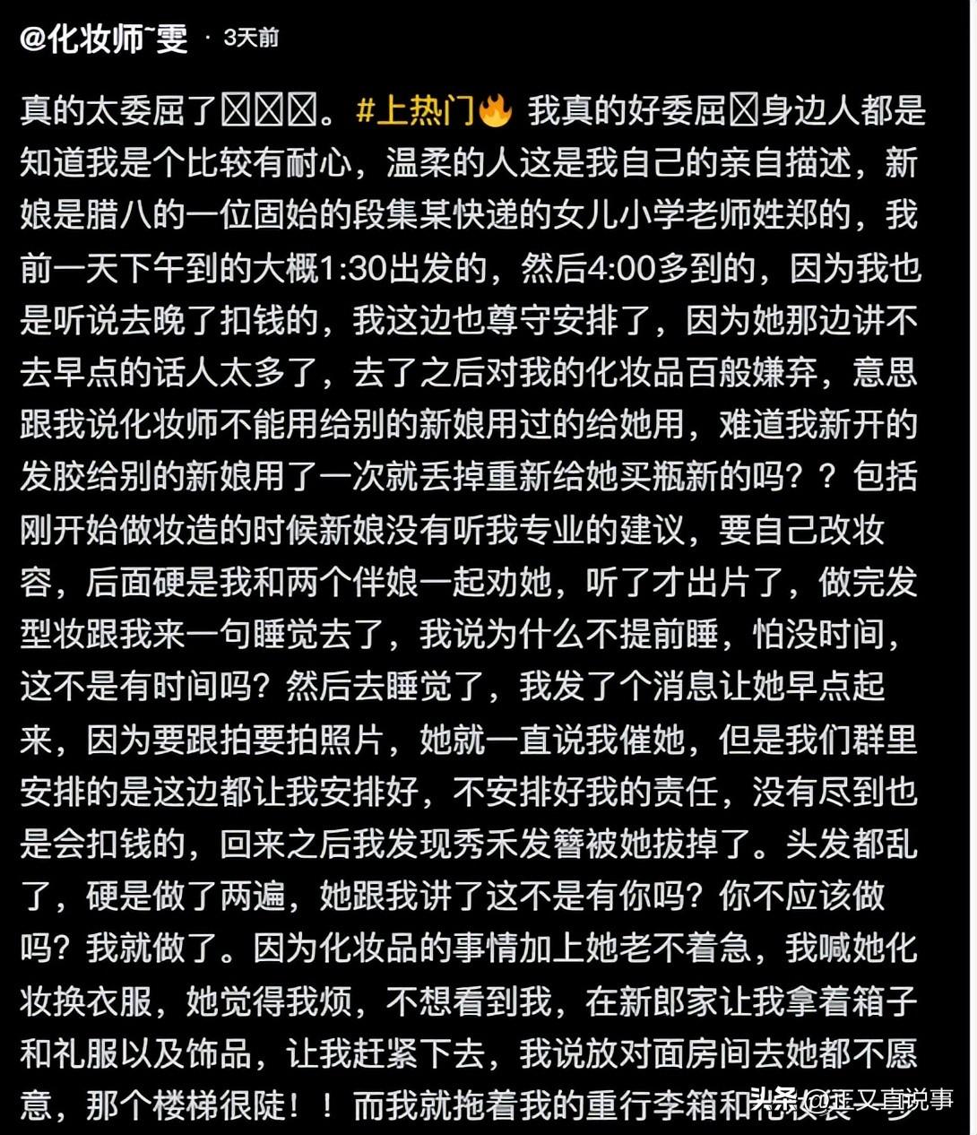 固始新娘避雷事件彻底翻车,原本抢先发帖控诉他人的郑某,反倒被多方实锤,沦为全网吐槽的对象。随着舆情持续发酵,郑某的真实身份、过往行径被逐一扒出,涉事化妆师、摄影师、伴娘接连出面发声,每一份爆料都让这场婚礼闹剧的真相更加清晰。 此前郑某在社交平台发布长文,直指婚礼化妆师服务失职,还公开对方联系方式呼吁大家避雷,一度收获不少网友的共情。她刻意塑造出被怠慢的受害者形象,话术缜密、迷惑性极强,让不明真相的网友纷纷为其站队。可这份“完美控诉”,没能撑过几天就被彻底戳破。 郑某的真实身份率先被网友扒透。多方交叉核实确认,郑某是固始当地一所小学的在职教师,其父母、兄长等近十位亲属都扎根教育行业,妥妥的“教师世家”。这份自带“为人师表”标签的身份,与她后续被曝光的言行形成极大反差,也让事件多了一层讽刺意味。 最先打破谎言的是被控诉的化妆师。化妆师晒出完整聊天记录、现场视频和付款凭证,还原了整场合作的真相。两人经本地婚庆群结识,签约时郑某言语谦和,可婚礼前夜就单方面要求化妆师提前五小时抵达。化妆师冒雨赶至后,郑某却酣睡不起,全程零回应、零致歉。 妆造过程中,郑某百般挑剔,以化妆品非全新未拆封为由发难,无视合同约定的“专业复用级产品”及工具已严格消毒的事实。她拒绝听从化妆师的专业建议,强行指定不符合自身脸型与灯光的妆面风格,还在妆面定稿后临时要求返工,硬生生将两小时的妆程拉长至五小时。 更过分的是,郑某曾三次从背后猛推化妆师,当时两人正处于陡峭的旧式楼梯旁,险些造成安全事故。她还强令化妆师单手拖拽20公斤的摄影补光箱,反复攀爬楼梯,全然不顾对方的人身安全。婚礼结束后,郑某不仅克扣100元尾款,还将化妆师的私人物品粗暴扫出门外,甚至电话辱骂后直接拉黑。 紧接着,摄影师也出面披露细节。郑某同样以扣钱相威胁,强制要求摄影师提前12小时到场,还额外指派布置新房的任务,远超摄影服务的约定范畴。摄影师凌晨4点按约抵达后,被郑某的父亲以“大半夜扰民”为由拒之门外,被迫在零下3℃的冷雨中站立三小时,相机电池冻至关机、镜头起雾。 结算尾款时,郑某反复质疑拍摄效果,还纵容亲属对摄影师实施推搡动作。面对质疑,她竟以“开个玩笑”轻描淡写带过,直到摄影师联系其婆婆施压,才勉强结清尾款。另一位摄影师也在评论区佐证,证实自己同样遭到了郑某的刁难,只是未公开吐槽。 伴娘的爆料则让郑某的口碑彻底崩塌。这位伴娘是受朋友所托,专程从郑州赶来救场,却全程被当成无偿苦力。她抵达后不仅没喝上一口热茶,还被郑某埋怨来晚,随后被安排贴喜字、搬重物、打扫卫生等一堆杂活,婚礼全程连一口饭都没吃上。 抛捧花环节,伴娘幸运接住花束,郑某却当场上前夺回,称要永久珍藏。原定的伴手礼也被郑某悄悄藏起近半,仅用廉价物品搪塞伴娘。这位伴娘坦言,自己本是好心帮忙,不求感谢,却没想到遭到如此不尊重的对待。 随着更多知情人现身,郑某的过往黑史也被曝光。有自称她高中同学的网友透露,郑某学生时代就极度自我中心,常因琐事与同学争执,毕业十年没有一人愿意与其保持联络。还有她订婚时的化妆师也出面吐槽,曾因郑某的主观挑剔被克扣300元服务费。 这场闹剧的核心,从来不是服务方失职,而是郑某漠视他人、缺乏契约精神的自私行为。她借“新娘”身份的天然共情,试图用舆论裹挟他人,却低估了网友的甄别能力和证据的力量。身为教师,本该以身作则传递尊重与包容,可她的言行却完全背离了“为人师表”的准则。 如今舆论反转,郑某及其家人已将社交账号设为私密,试图逃避指责。这起事件也给所有人提了个醒,尊重是相互的,无论身份高低、场合特殊,都不能肆意刁难他人。舆论可以共情弱者,但绝不会偏袒自私自利、颠倒黑白的人,违背公序良俗的言行,终究会被真相反噬。