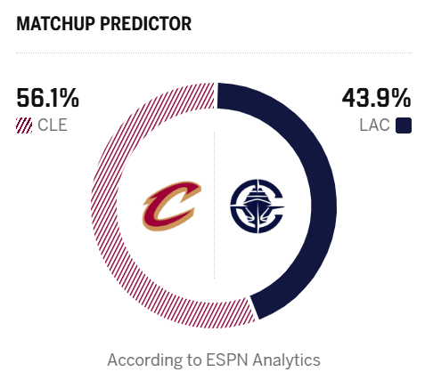 ESPN预测明日比赛:骑士胜率56.1%,快船胜率43.9%