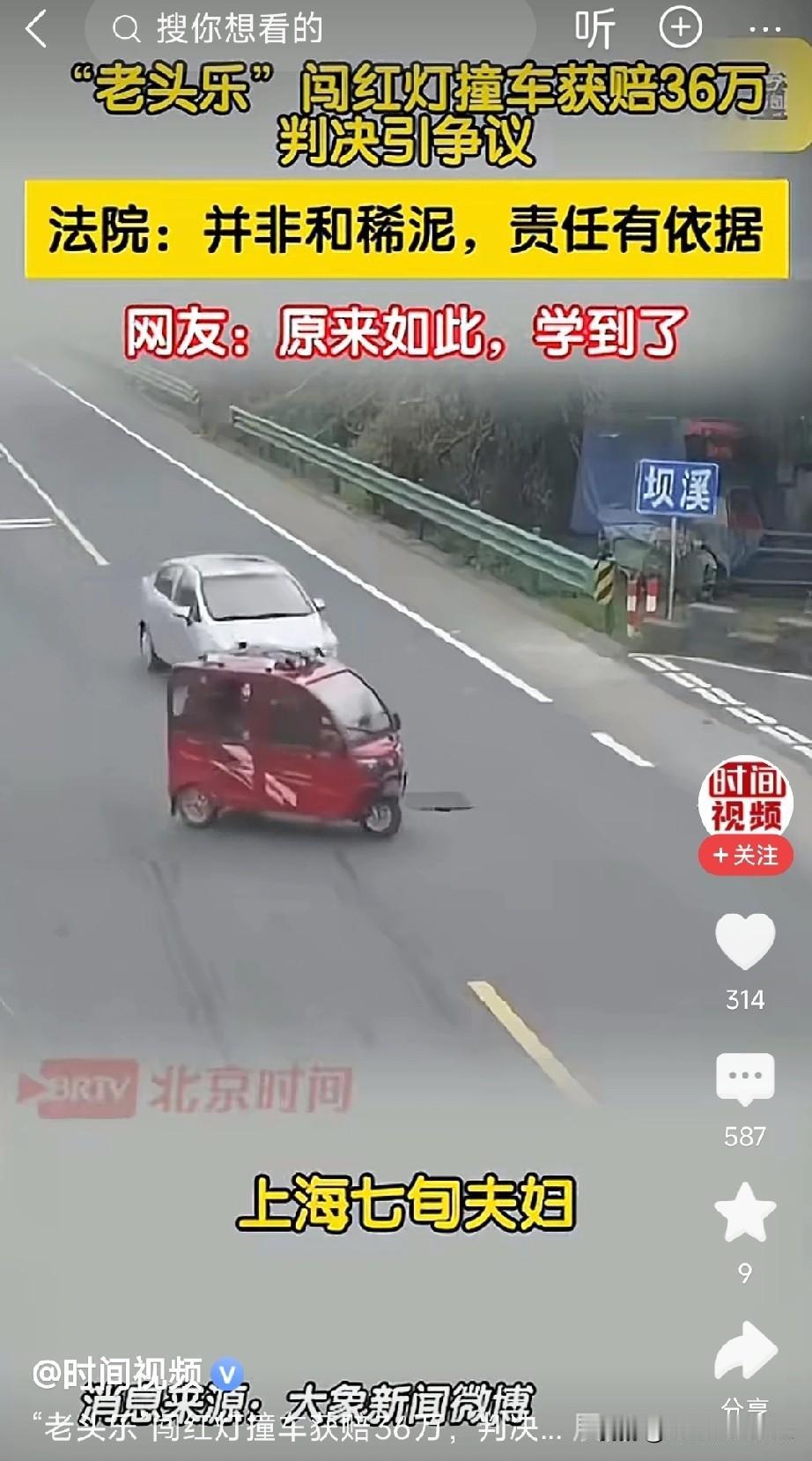 老头乐闯红灯而且违规上路不应该全责吗?这不是谁哭,谁闹谁有理吗? 我只想问老头乐有路权吗?这起事故直接原因是闯红灯吗?老头乐即使不是全责也是主要责任。责任划分三七开,怎么七十万索赔偿别人要承担36万呢?