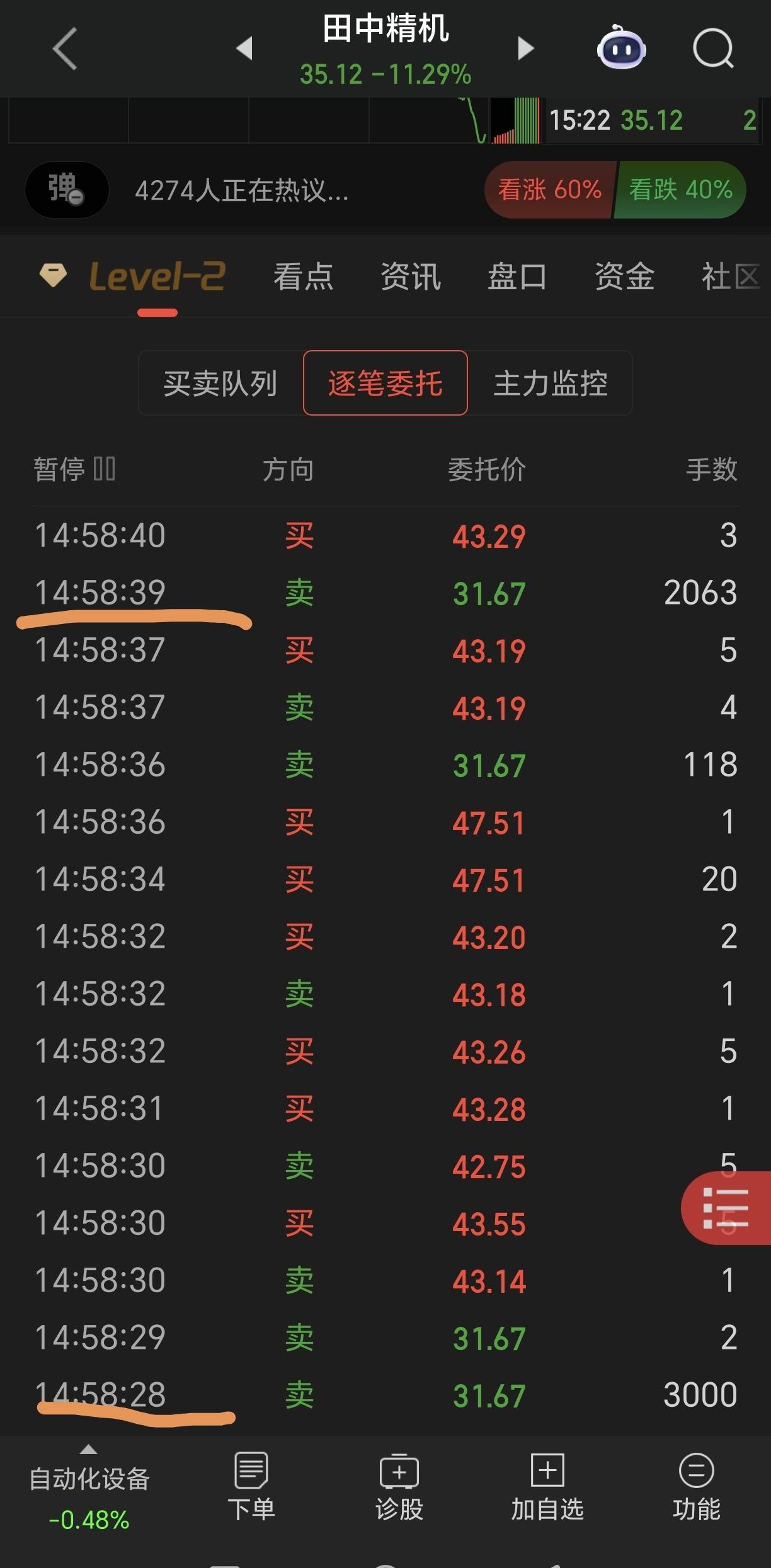 某个股票(名字不能说)尾盘竞价暴跌20%,尾盘竞价清单显示不是乌龙即买点减卖,有人在2点58分59分跌停价出货,共分3笔,6000多手,这股高位成交了十多万手,没必要突击搞这个几千手的!不过也不排除最后两分钟有人发现钱不够用了,必须卖出,明天拿钱!有一种更大的可能性,是利益输送,利益获取方获取方在低位埋单,利益输送方将股票猛的砸下去超埋入价并确保成交!以这种方式送礼,鬼都查不出来!实在是高!这种方式多年来也经常的会有!看多了就不怪了!明天肯定是高开十个点以上甚至一字板20%涨停的!立此为%!