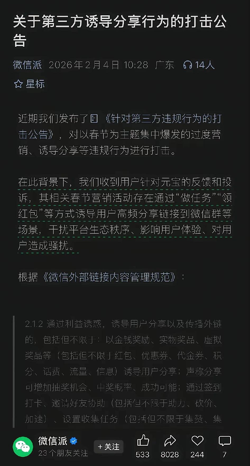 这下应该没有人再质疑微信的经营独立性了吧。 毕竟微信作为老大都对自己的亲兄弟元宝出手惩罚了。 但这个消息对于准备在过年期间开启大战别的人工大模型来说也不是什么好消息。因为这也说明了别的人工大模型更别想在微信用链接抢红包推广了。 不管怎么说元宝这位兄弟已经在微信推广好几天了,据说下载量惊人,算是抢了先机。