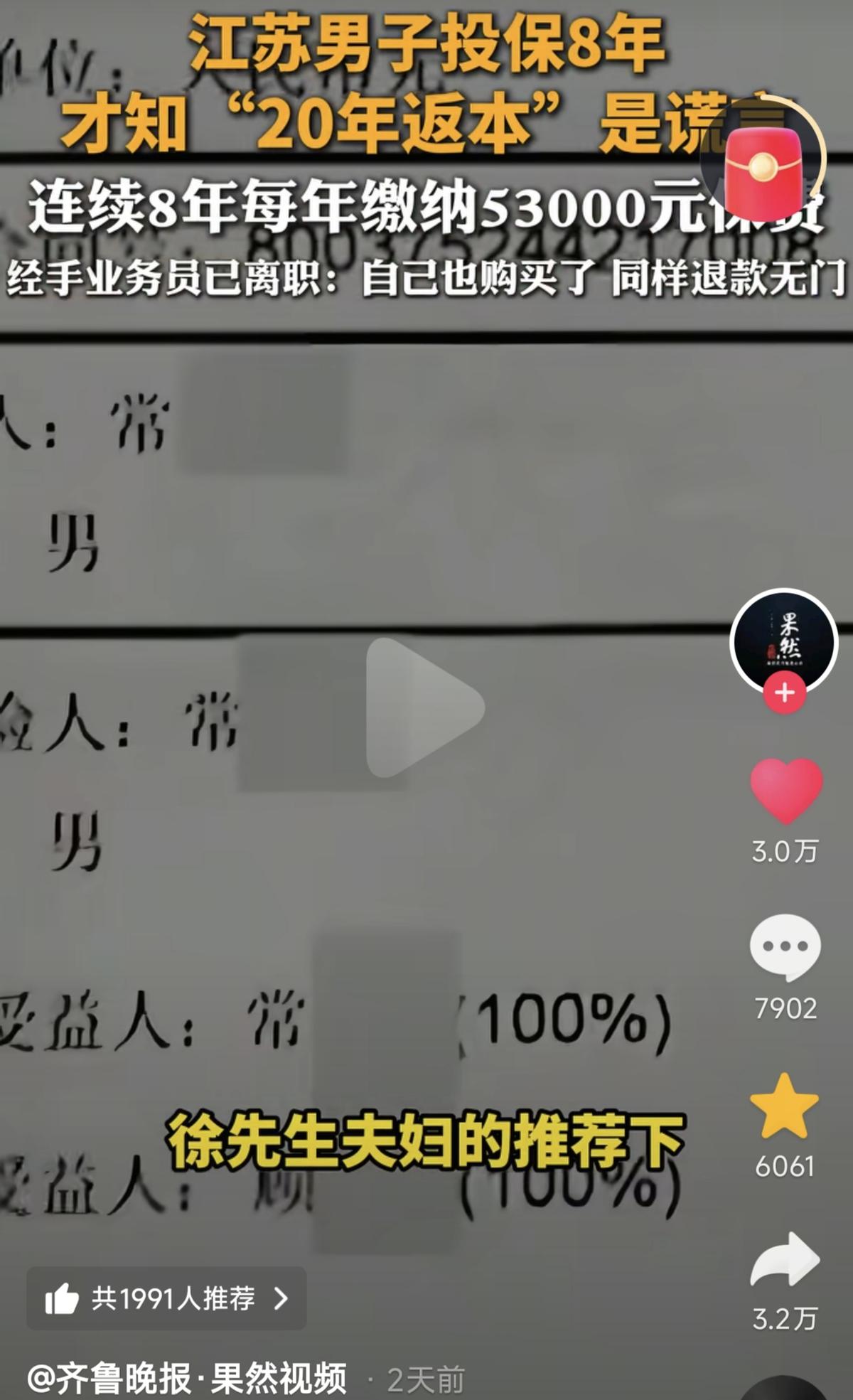 “防不胜防!”江苏一男子投保8年每年缴纳53000元,近日才发现“20年返本”就是一个天大的谎言,男子想要全额退款,但当年办理的业务员已经离职退款无门,男子陷入面临高额亏损的愤慨与痛苦中。网友感叹:最不保险的就是买保险! 江苏盐城常先生的遭遇绝非个例,更不是偶然,而是保险行业长期存在的销售乱象结出的必然果实。八年时间里,他每年从牙缝里挤出53000元,累计投入424000元,满心期待20年后能拿回本金,给晚年生活上个“双保险”,可到头来却发现,所谓的“20年返本”不过是业务员画下的大饼,那份被吹嘘成“理财神器”的保险,实际是重疾险与意外险的组合,合同里压根没有“返本”的半个字眼,如今想要退保,不仅拿不回一分本金,还要面临巨额亏损,而当初拍着胸脯承诺的业务员早已离职,保险公司则以“合同为准”为由推脱责任,让他叫天天不应叫地地不灵。 这样的戏码在全国各地每天都在上演,打开保险投诉平台,满屏都是类似的控诉:有人被业务员忽悠“交10年保终身,到期返本还能赚利息”,结果缴费期满后想要退保,发现现金价值还不到已交保费的一半;有人买保险时被承诺“生病能赔,没病返本”,真到需要理赔时却被各种条款限制拒之门外,想要退保又只能血本无归。 国家金融监督管理总局的数据更是直接戳破了行业假象,仅今年一季度,银保监会及其派出机构就接收并转送涉及保险公司的保险消费投诉37892件,同比增长129.73%,其中人身保险公司的投诉里,普通人寿保险纠纷就有9184件,占比高达41.09%,而这些纠纷中,销售误导几乎是最核心的导火索。 之所以“返本保险”会成为重灾区,本质上是业务员利用信息不对称玩的文字游戏。对普通消费者来说,保险合同条款晦涩难懂,满篇都是专业术语,而业务员恰恰抓住这一点,只拣好听的讲,把“现金价值”偷换成“本金返还”,把“保险期间”模糊成“返本年限”,至于合同里的关键限制条件,要么绝口不提,要么一笔带过。 更让人无奈的是,保险行业的业务员流失率高得惊人,很多人干不了几年就离职,他们卖保险时只想着拿高额佣金,根本不管后续服务和纠纷,一旦出了问题,保险公司就会把责任推给“离职业务员的个人行为”,让消费者陷入“口说无凭”的困境。 就像常先生这样,当初没有留下书面证据,如今就算想维权,也拿不出业务员承诺“返本”的铁证,只能吃哑巴亏。 而所谓的“返本”本身就是个伪命题,就算合同里有相关约定,也藏着看不见的陷阱。业务员口中的“返本”,往往要么是指几十年后的现金价值,要么是合同约定的基本保额,可实际情况是,大多数长期险在缴费期内的现金价值低得可怜,以市面上一款常见的年金险为例,每年缴费5万元,缴费10年,第20年的现金价值还赶不上已交保费,更别说抵消通货膨胀带来的货币贬值。 常先生每年交53000元,交8年,就算20年后现金价值能勉强接近已交保费,这20年里这笔钱的机会成本也足以让他亏得明白——如果把这些钱拿去做稳健理财,哪怕是年化3%的收益,20年后的本息和也会远超保险的现金价值。 更讽刺的是,很多业务员在推销时压根不会提现金价值和通货膨胀,只一个劲强调“保本”,把保险包装成稳赚不赔的理财产品,可实际上,保险的本质是保障,而非理财,所谓的“返本”不过是吸引消费者掏钱的噱头。 虽然监管部门早就出台了《保险销售行为管理办法》,要求保险公司规范销售行为,实行销售前提示、销售中双录、销售后回访等制度,但在实际执行中,这些规定往往被打了折扣。 很多线下销售场景中,双录制度形同虚设,业务员要么不录,要么只走个过场,消费者根本没有机会仔细阅读合同条款;而回访电话大多是机器人拨打,问题设置简单,根本无法核实消费者是否真正了解保险内容。 就算消费者想维权,也面临着举证难、成本高的问题,12378投诉热线虽然有效,但很多人并不知道这个渠道,就算知道,从投诉到处理也需要漫长的等待,很多人耗不起时间和精力,最后只能不了了之。 常先生的遭遇不过是保险行业销售乱象的一个缩影,那些被业务员吹得天花乱坠的“返本保险”,说到底就是一场精心设计的骗局,骗的是消费者的信任和血汗钱。 保险公司靠着这些虚假承诺吸纳巨额保费,业务员赚得盆满钵满,唯独消费者被蒙在鼓里,等到真相大白时,早已损失惨重。 所谓“保险”,本该是规避风险的屏障,可如今却成了制造风险的源头,也难怪网友会感叹“最不保险的就是买保险”。当一份保险需要靠谎言才能卖出去,当消费者的权益得不到有效保障,这样的保险行业,终究难以走得长远。