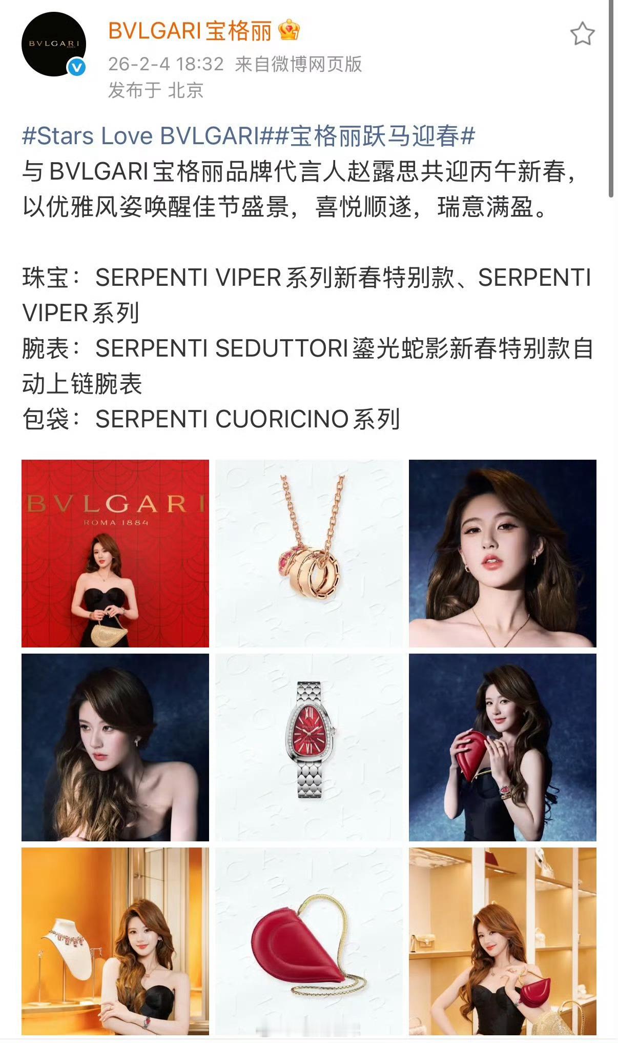 宝格丽压轴宣赵露思新春大片,并且是唯一一个宝格丽新春系列九宫格,品牌方就这样宠代言人!