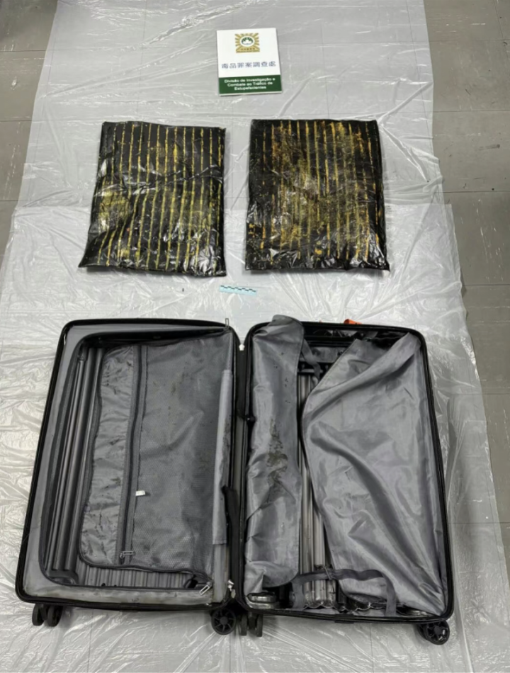 据澳门司法警察局介绍,1月31日,司警局毒品罪案调查处结合情报和风险排查,对一名从海外搭乘航班飞抵澳门的可疑男子进行截查。经截查,发现其携带的行李箱重量较为可疑。警方随后在其行李箱夹层内,检获两个表面沾有刺激性气味的咖啡粉和辣椒油的胶袋,怀疑借此掩盖毒品味道并蒙骗缉毒犬,胶袋内则藏有重约4559克怀疑为毒品的乳白色颗粒。