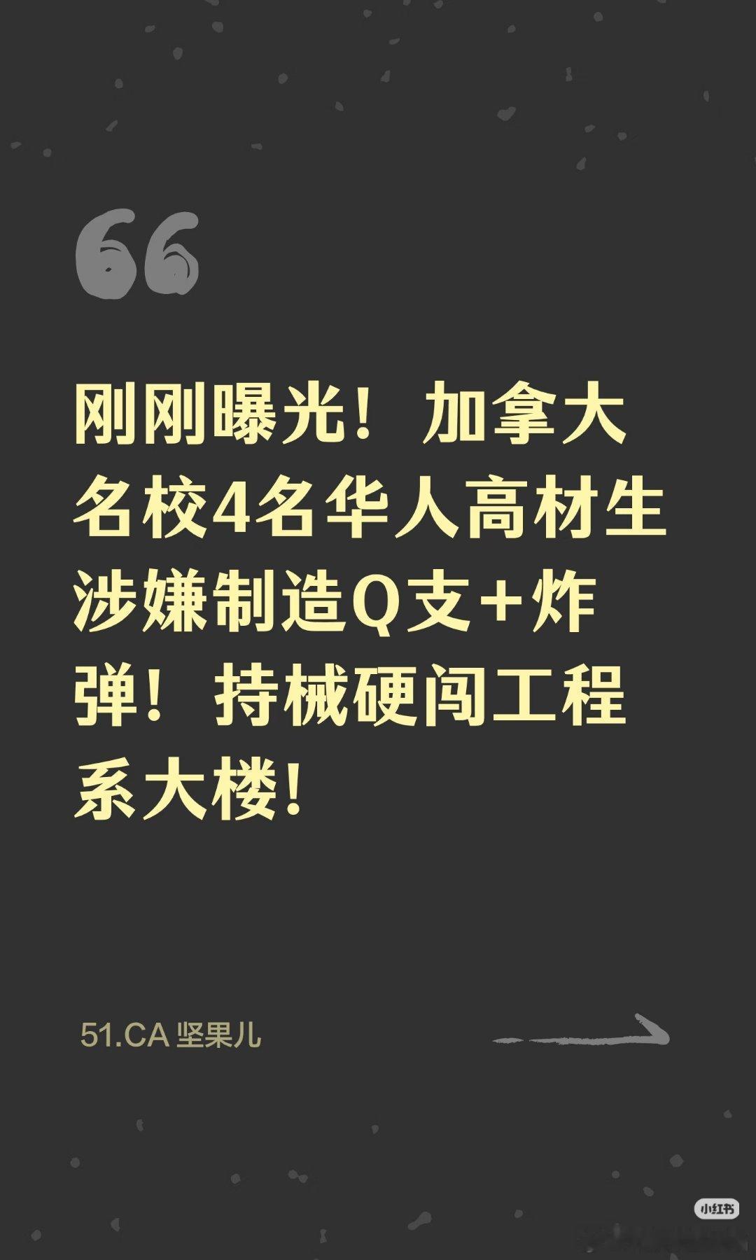 据网友爆料,加拿大四名华人高材生(3男一女)涉嫌制造武器持械硬闯工程系大楼