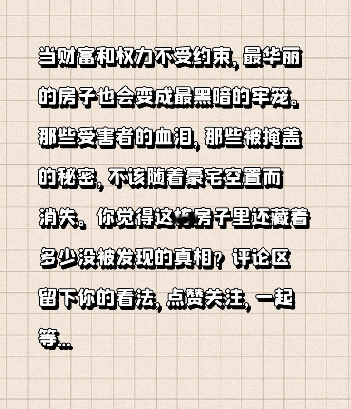 爱波斯坦豪宅有多诡异?进门先见一排假眼球,密室藏着权贵黑暗 你敢信吗?这栋价值8800万美元的纽约豪宅,进门不是奢华装饰,而是一排排装在相框里的假眼球,沿着走廊一直延伸到楼梯口!更吓人的是楼梯正上方,挂着一尊新娘雕塑,双手死死攥着绳子,仿佛随时会坠落。这就是爱波斯坦的“恐怖城堡”,表面是顶级豪宅,内里藏着连电影都不敢拍的黑暗秘密。 推开沉重的橡木门,诡异感扑面而来。客厅里摆着一具巨型老虎标本,眼神阴森地盯着门口,旁边钢琴上还放着一只被制成标本的黑色贵宾犬。墙上挂满了年轻女性的阴郁画作,混搭着他与教皇、总统的合影,一边是权贵象征,一边是令人不安的意象。最反常的是他的卧室:豪宅里唯一简朴的房间,只有一张单人床和老式书桌,和其他区域的奢华形成刺眼对比,心理学家说这是他用来强化支配欲的“控制美学”。 但真正的恐怖藏在暗处。地下室被改成全隔音密室,门只能从外部打开,红色暗灯照着冰冷的墙壁;三楼的“治疗室”摆着按摩床和昂贵的电磁仪,表面是身心疗愈,实则是受害者控诉的犯罪现场。更细思极恐的是书房,看似满墙的书架,其实暗藏保险箱和秘密隔间,而监控室能实时调取他所有房产的画面,还装着信号干扰器,比小型企业的安保还严密。 看到这你可能会想,这只是富豪的怪癖?但转折点来了:这些诡异设计全是精心布局。门口的假眼球、走廊的傀儡艺术品,是在暗示“进来就别想逃”;满墙的权贵合影,是用来恐吓受害者的“保护伞展示”——爱泼斯坦会指着照片说“这位法官上周还在我游艇上”。而豪宅里发现的《洛丽塔》初版、儿童角色扮演服装,更直白暴露了他的邪恶癖好。 更讽刺的是,掌握这一切秘密的爱泼斯坦,在狱中“自杀”身亡,监控恰好故障、颈部骨折疑点重重,而350万页公开文件里,还有一半被涂黑。这栋豪宅如今空置,但那些假眼球的凝视、密室的回音,都在诉说着未被揭开的真相。 当财富和权力不受约束,最华丽的房子也会变成最黑暗的牢笼。那些受害者的血泪,那些被掩盖的秘密,不该随着豪宅空置而消失。你觉得这栋房子里还藏着多少没被发现的真相?评论区留下你的看法,点赞关注,一起等待正义降临。