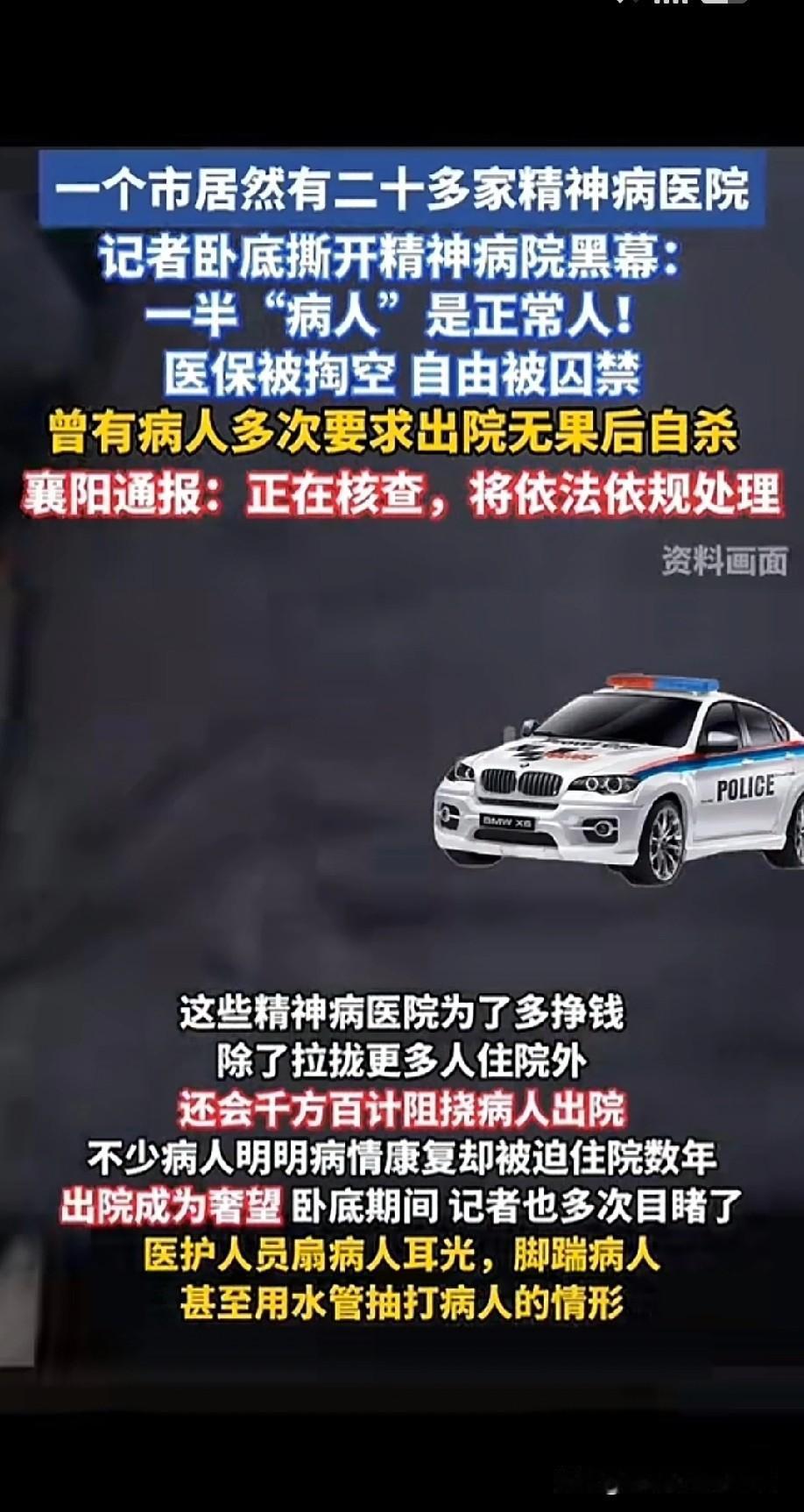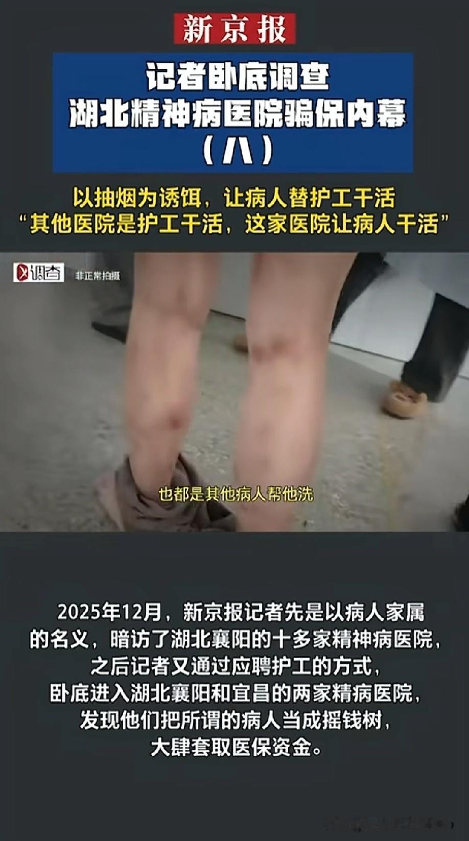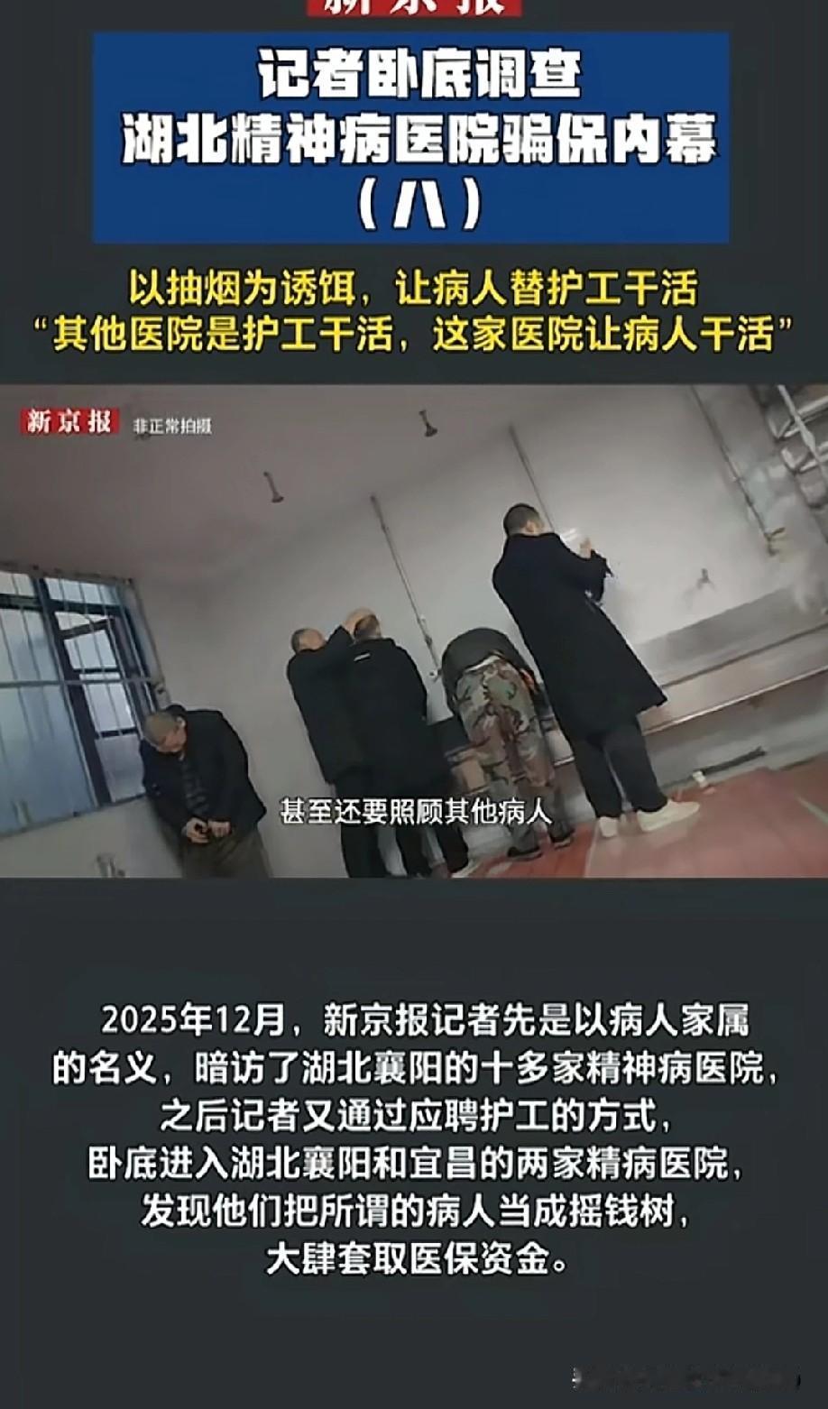 细思极恐!湖北精神病医院黑幕:一半“病人”是正常人,医保被掏空,自由被囚禁!!! 湖北襄阳,一个地级市,居然开了二十多家精神病医院。这不是医疗资源充沛,而是一场精心策划的骗局。 新京报记者卧底调查,撕开了这个行业的遮羞布。他们发现,这些医院为了套取医保资金,把正常人强行收治入院。在一些医院里,一半的“病人”根本没病。他们被限制人身自由,出院成了奢望。有病人多次要求出院无果后,绝望自杀。 更令人发指的是,这些医院不仅把病人当成摇钱树,还把他们当免费劳力。医护人员用香烟当诱饵,逼迫病人替护工干活,给其他病人端屎端尿。记者甚至亲眼目睹,医护人员对病人扇耳光、脚踹、用水管抽打。 这已经不是简单的医疗腐败,而是赤裸裸的犯罪。医保基金是老百姓的救命钱,却被这些黑心机构当成了提款机。精神障碍患者是社会最脆弱的群体,他们本该得到关怀和治疗,却成了被囚禁、被虐待的工具。 目前,襄阳官方已经通报正在核查。我们期待一个彻底的调查,不仅要严惩这些医院的经营者,更要深挖背后的监管漏洞。毕竟,二十多家医院同时作恶,不可能是孤立事件。 这件事也给我们所有人敲响了警钟:当资本盯上了弱势群体的救命钱,我们每个人都可能成为潜在的受害者。 湖北 精神病医院 医保诈骗