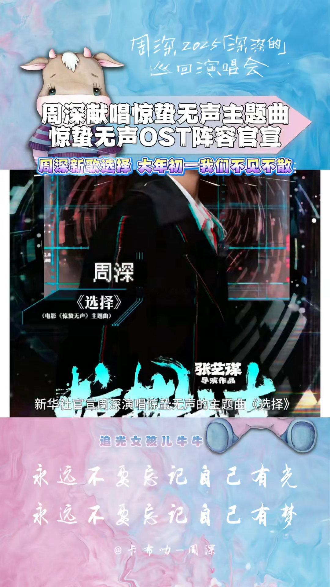 张艺谋周深二搭张艺谋与周深再度强强联手,继《悬崖之上》后,为国安谍战大片《惊蛰无声》献唱主题曲《选择》。周深以极具叙事感的空灵嗓音,将影片中无名英雄在信仰与抉择间的挣扎、坚守与热血诠释得淋漓尽致,每一句旋律都藏着暗流涌动的家国情怀,与张艺谋极具质感的镜头美学完美契合,声画交融间,将谍战题材的张力与深度拉满,堪称年度视听盛宴!