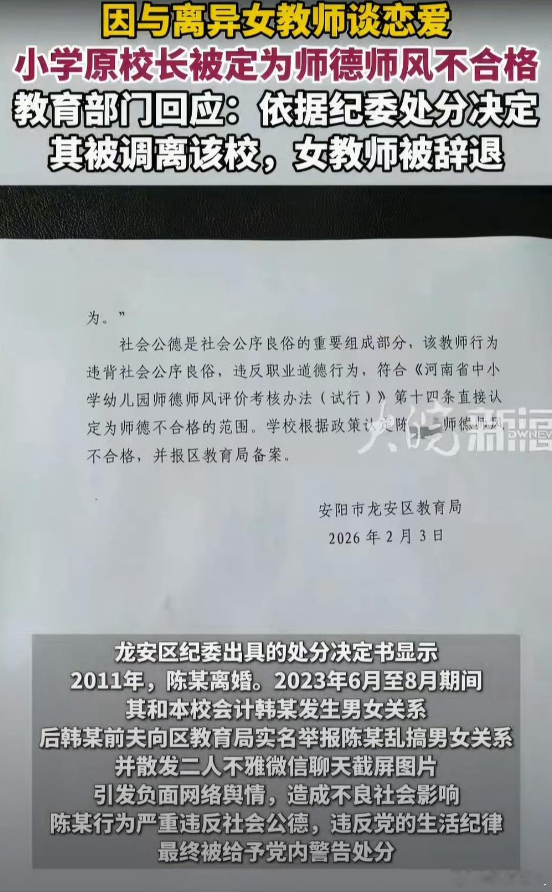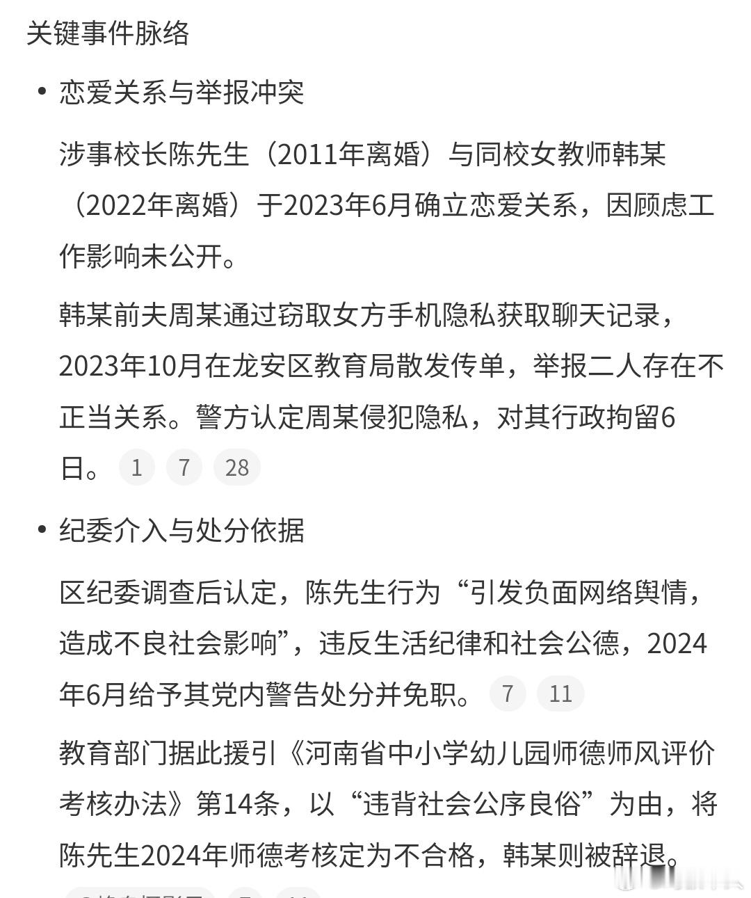 就是两个离婚的人,在同一个学校恋爱的,然后被女的人渣前夫举报造谣,搅黄了,最后两人被处分了……同事之间谈恋爱其实没啥,但问题就是校长和下属女教师,凡是构成这种权力不对等关系的很难撇开权力寻租或间接胁迫,所以欧美也是禁止的,处理到可以理解,但是纪Wei的理由就太奇葩了,说引发负面网络舆情???那人家也是舆情受害者,谁想引发舆情啊?引发舆情的是那个人渣前夫,还说违反社会公德,正常的想法和J委的完全不一样…….校长与离异女教师恋爱被定师德不合格