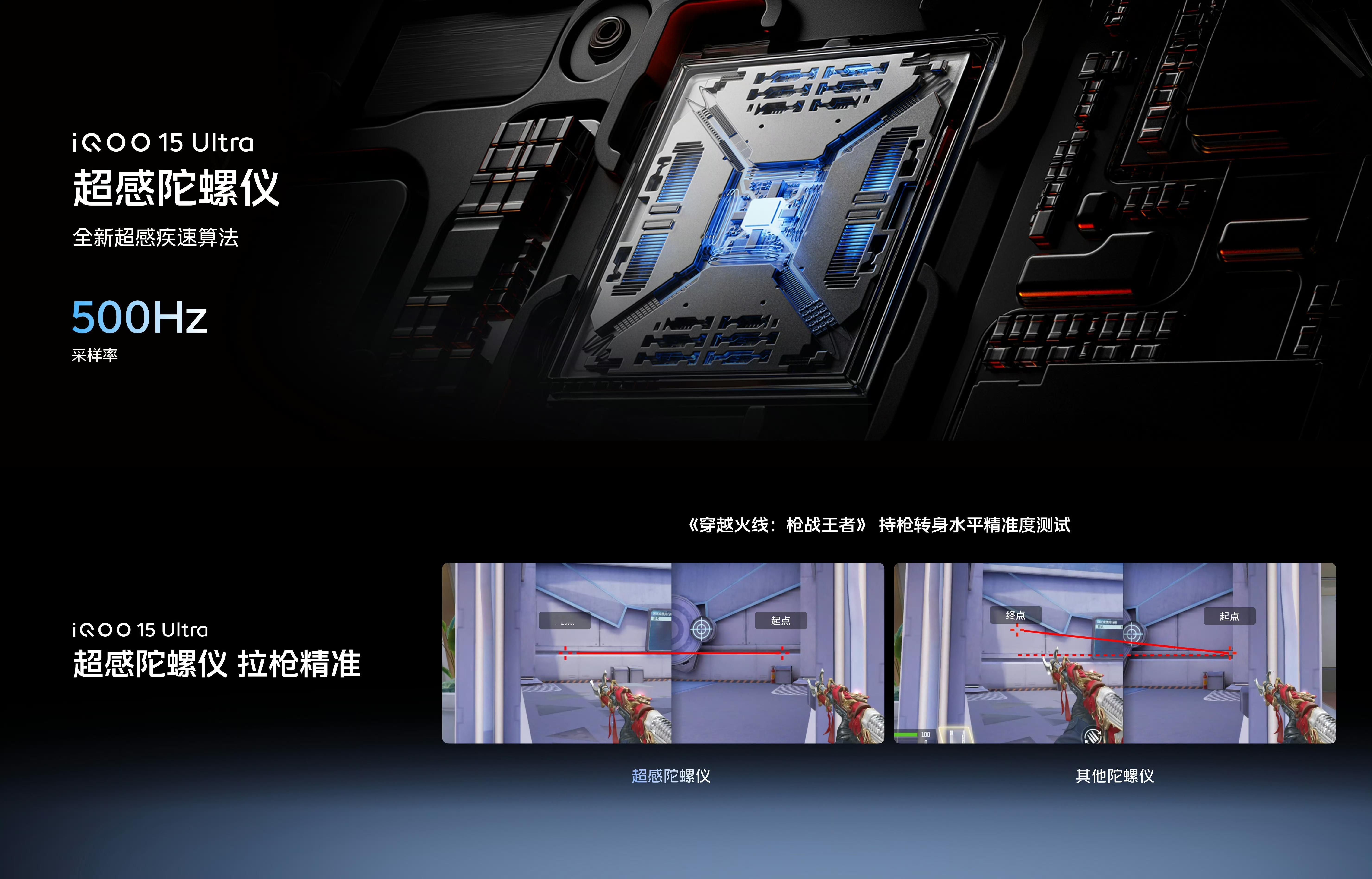 iQOO 15 Ultra提供超感游戏操控系统,包含肩键、陀螺仪和触控,全面提升操作体验。①肩键:600Hz采样率,响应速度低至32毫秒;②陀螺仪:500Hz采样率,结合自研算法精准捕捉手部动作;③触控:4000Hz瞬时采样率,480Hz多指采样率,与《三角洲行动》合作优化分区触控,提升响应速度和精准度。iQOO15 Ultra新品发布