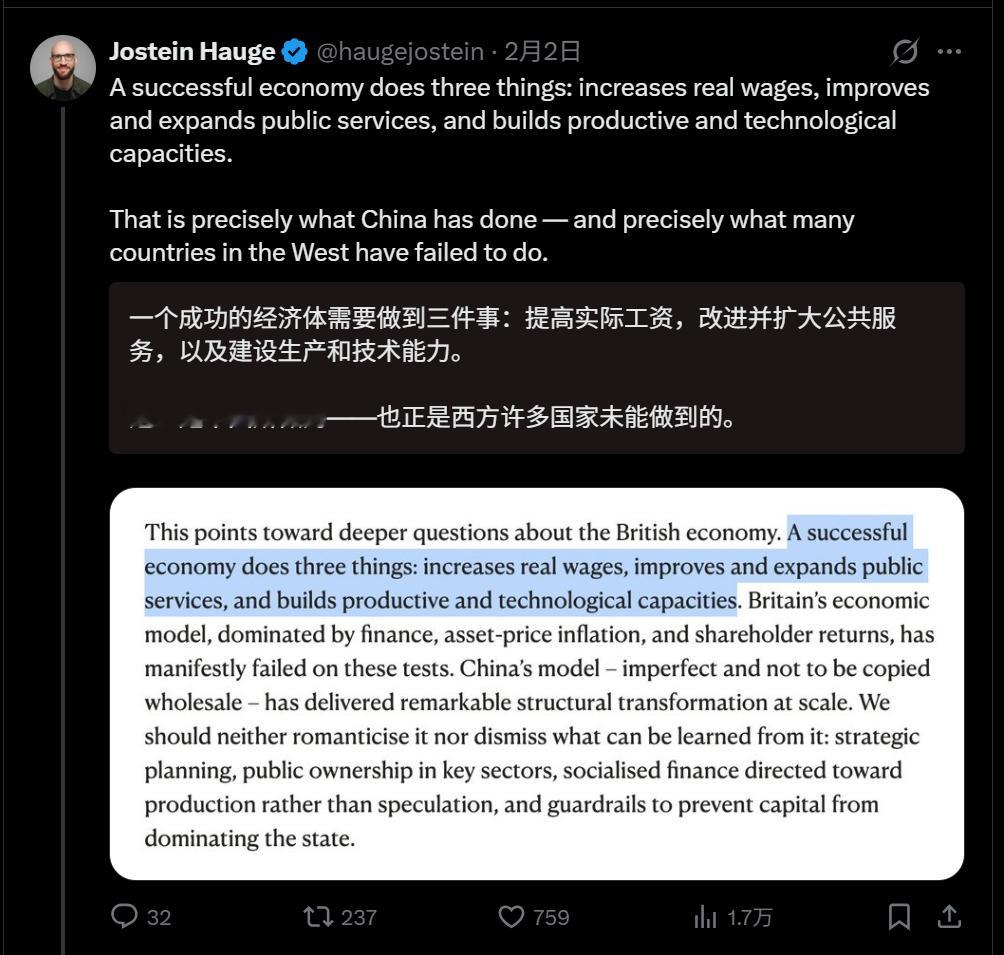 🔻剑桥大学助理教授 Jostein Hauge 说:“一个成功的经济体需要做到三件事:提高实际工资,改进并扩大公共服务,以及建设生产和技术能力。这正是中国所做的——也正是西方许多国家未能做到的。”🔻这是 James Schneider 刚刚在《新政治家》上发表的一篇精彩文章的摘录。🔻他还表示:“现在看得很清楚,唯一能让欧洲人抵制特朗普的事情,就是他威胁要将他们自己在亚洲、非洲和拉丁美洲已臻完美的帝国主义安排同样强加给他们。”海外新鲜事热点现场斯塔默回击特朗普涉中英言论