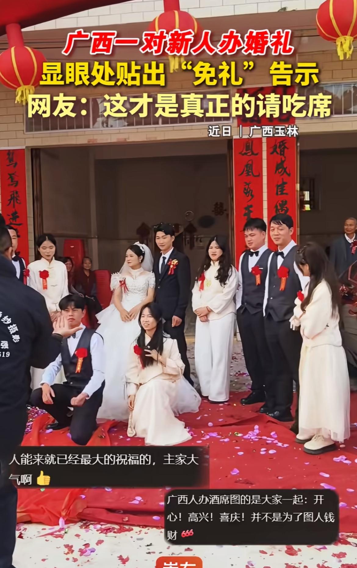 广西新人婚礼免礼的事太让人眼前一亮!之前就听说广西有些地方婚宴很有特色。有北方朋友去广西参加婚礼,按老家规矩随了 600 元礼。广西婚宴喜欢在乡下办,请邻里厨艺好的人当厨师,口味更合村民心意。菜品和广东类似,爱白切鸡,口味偏淡。 还有在广西罗定,参加婚礼宾客不仅不用随礼,还能拿红包。有人去参加婚礼找半天都没看到写礼金的人,问了才知道当地没随礼这习俗。这种做法真的很豪爽大气,难怪网友说这才是真正的请客,没有了随礼的负担,大家能更纯粹地享受婚礼的喜悦。
