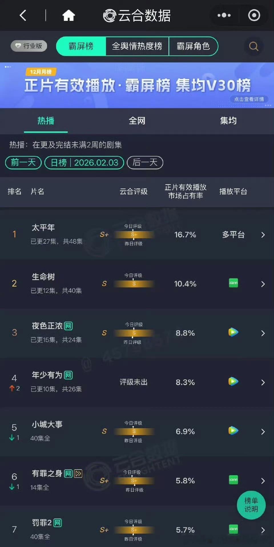 2.03云合:生命树10.4% S级年少有为8.3%风过留痕首日3.3%