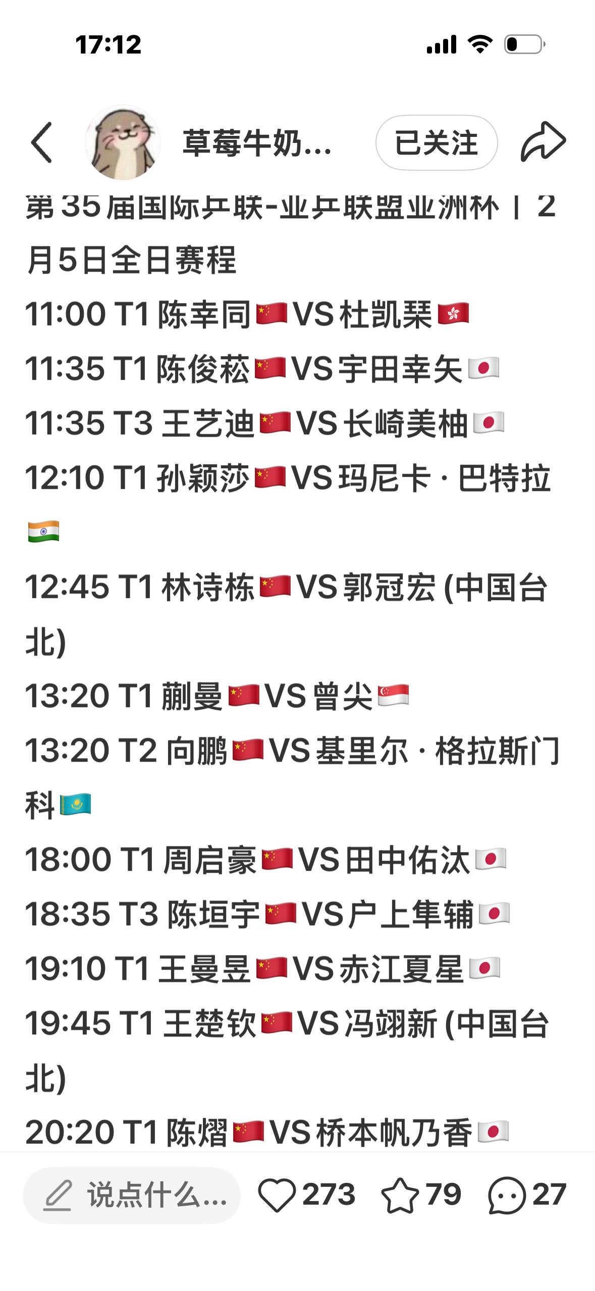 海口亚洲杯2月5日赛程—孙颖莎VS巴特拉 王楚钦VS冯翊新 2月4日,海口亚洲杯午场比赛中, 国乒队全部获胜! 2月5日赛程出炉, 两天的比赛时间一样, 终于把王楚钦的比赛往前调一调, 本来陈熠VS桥本帆乃香的比赛在前, 王楚钦的比赛在后, 现在调换一下, 19:45,王楚钦VS冯翊新, 陈熠压场比赛, 20:20,陈熠VS桥本帆乃香, 19:10,王曼昱VS赤江夏星, 小组赛采用单循环赛制, 一组四个人, 就是一比三, 每个人都要对阵, 然后三场比赛结束,看大比分, 如果比分一样,就会看小分! 孙颖莎12:10打巴特拉, 比赛加油!