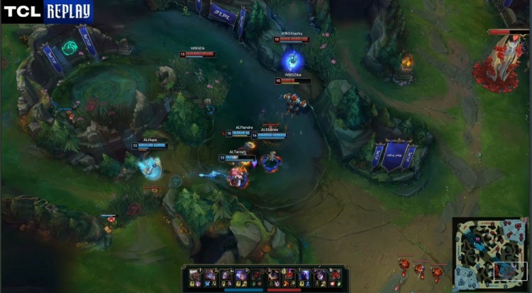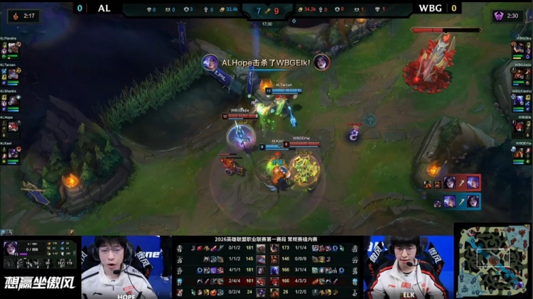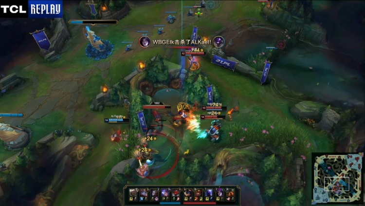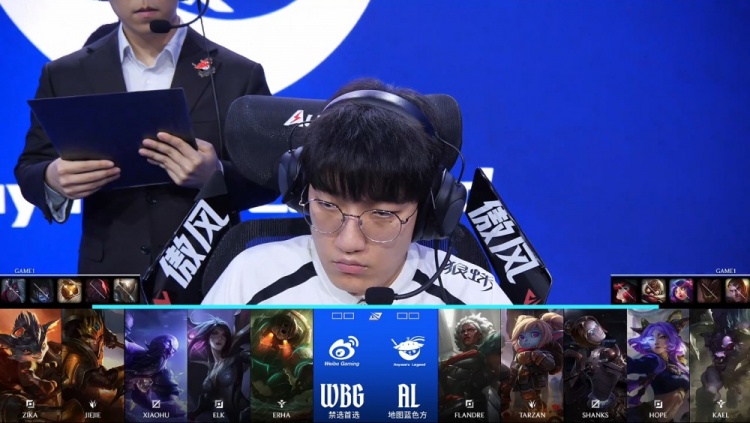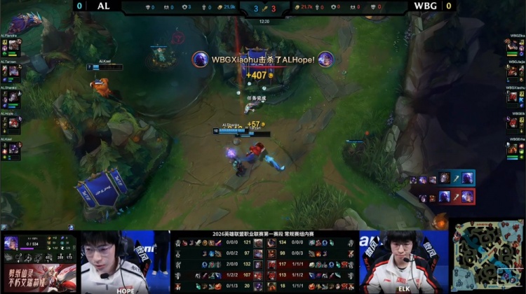 [11:40]下路混战,Erha泰坦率先被Tarzan壁咚上墙送王杰人头,Xiaohu瑞兹开车带队回马枪,Tarzan波比震飞WBG两人,随后Elk卡莎被Shanks发条搅掉后Xiaohu送Shanks双杀,AL打出1换3。