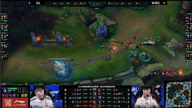 [9:20]下路2v2,Kael牛头二连上去被拉扯,Erha泰坦吃掉王杰芸阿娜一血,随后Elk卡莎点掉Kael牛头,WBG打出0换2。